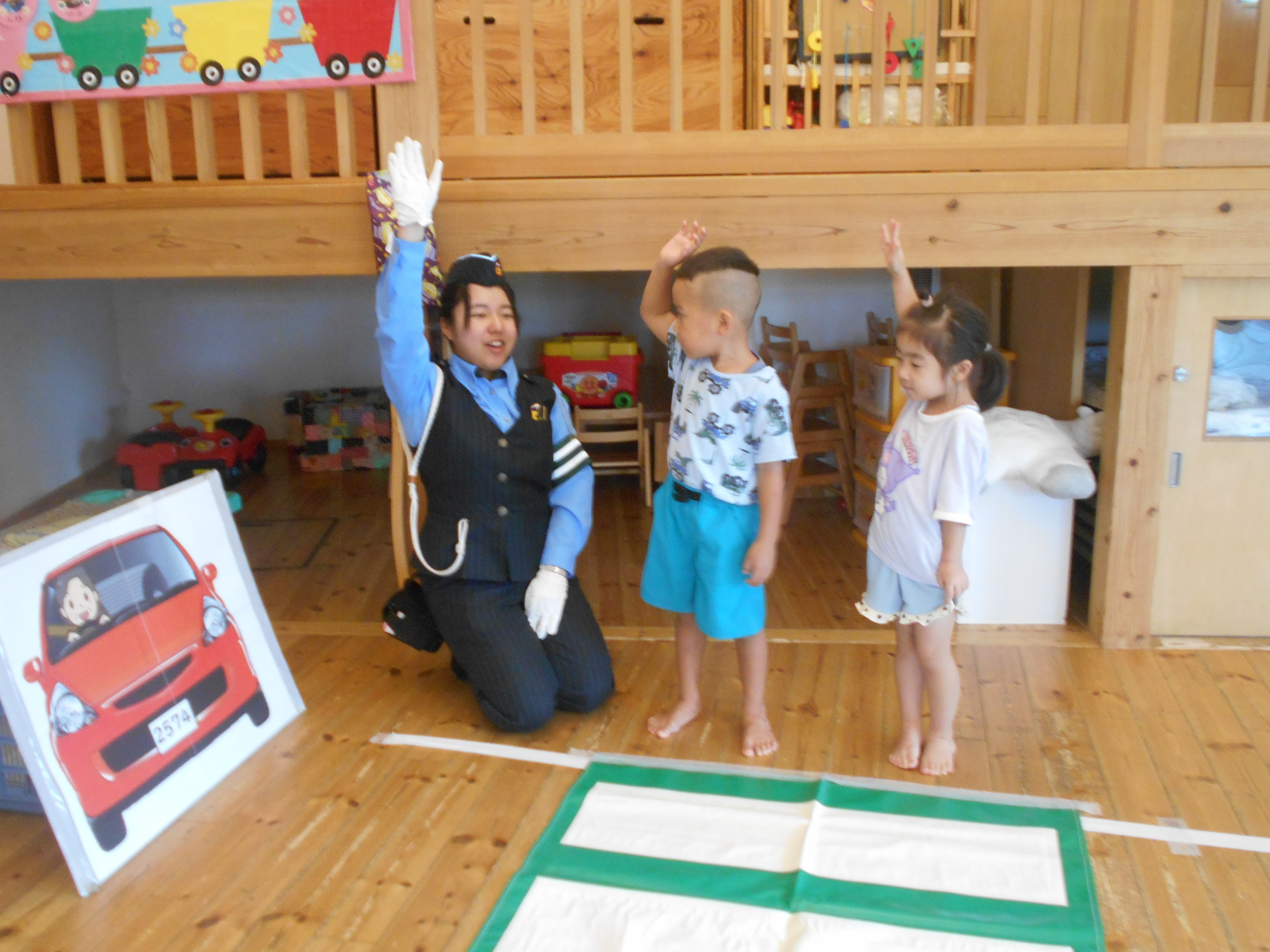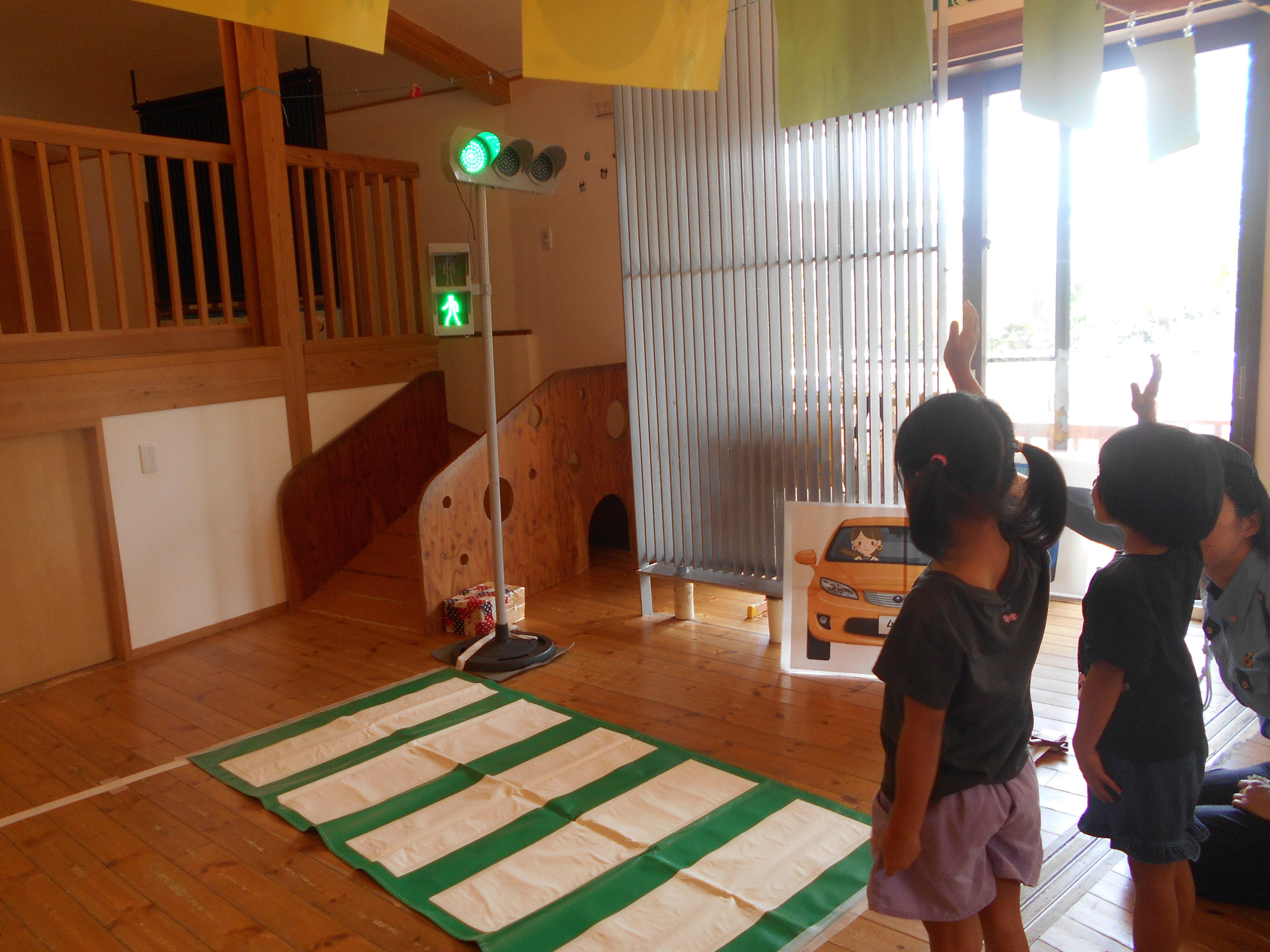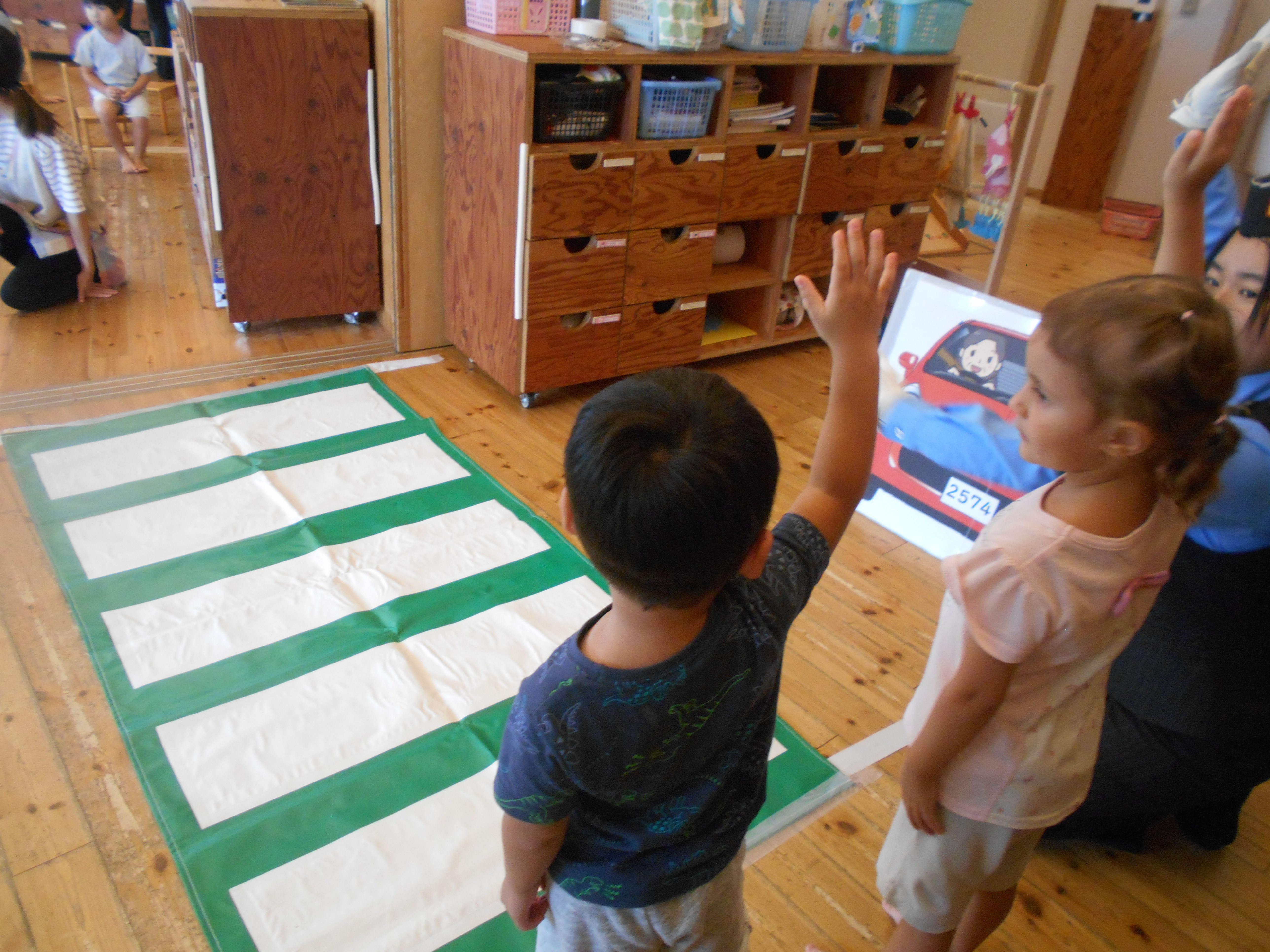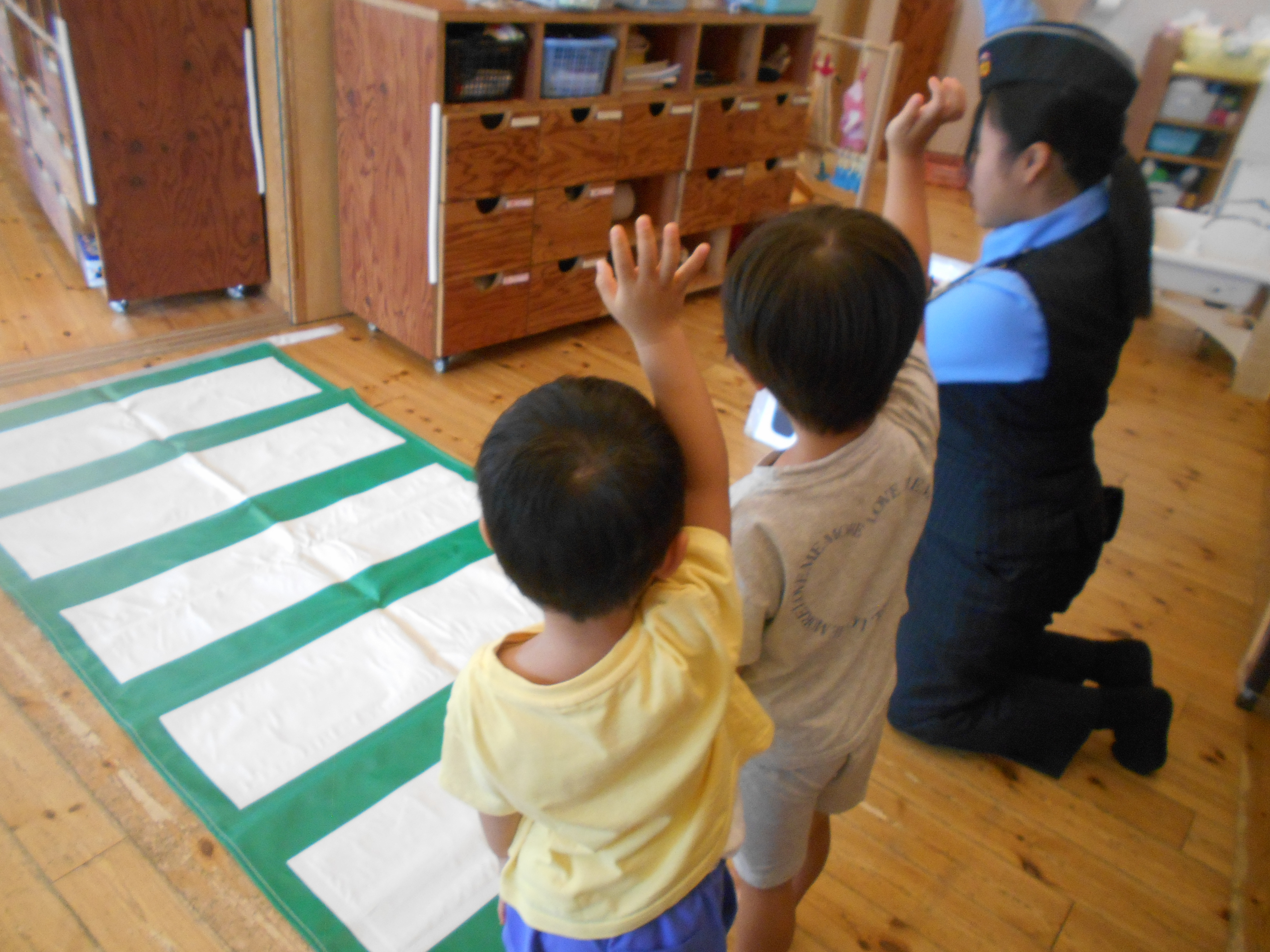 交通安全教室②保育室内で手を挙げてわたる練習! |