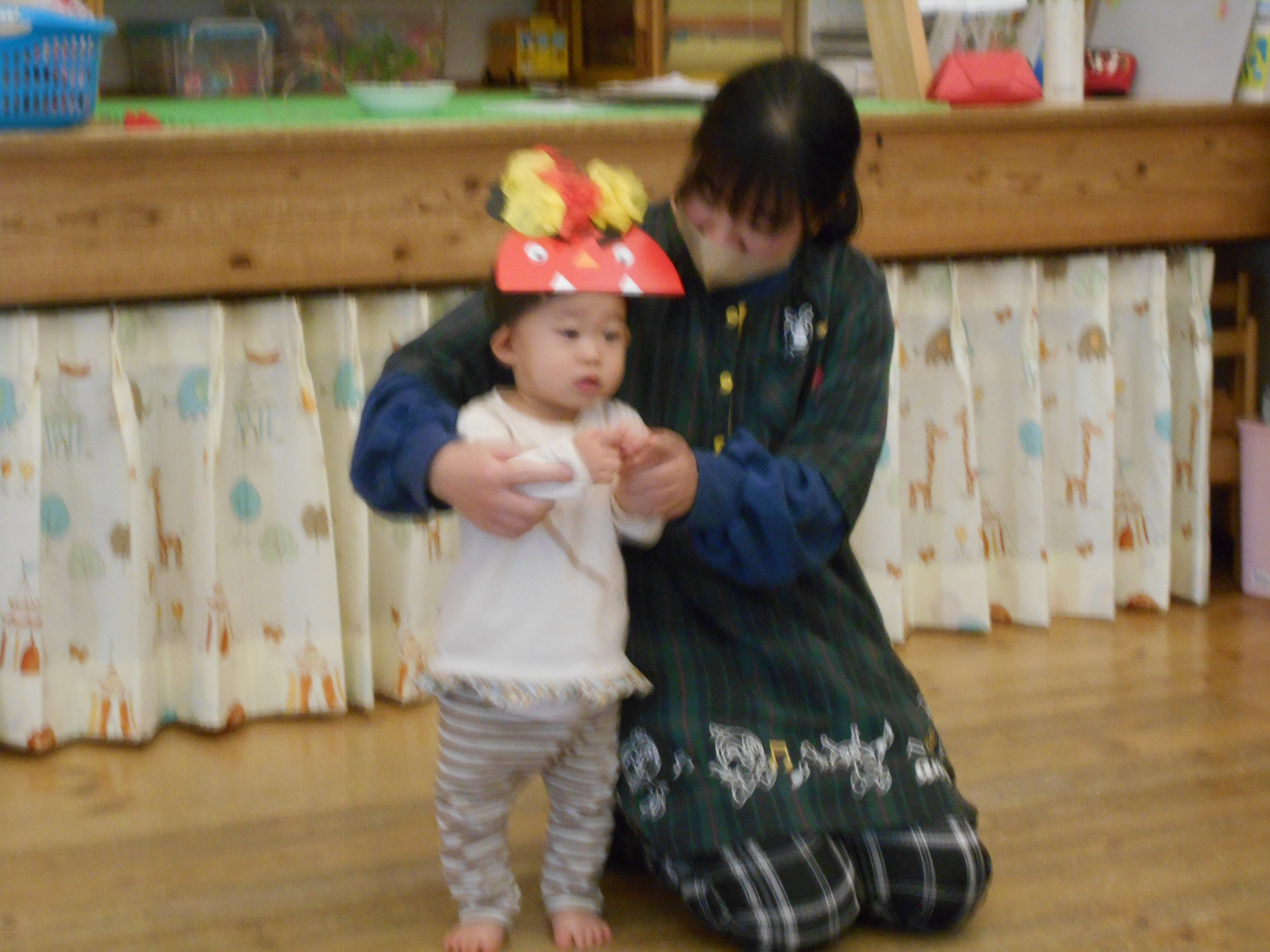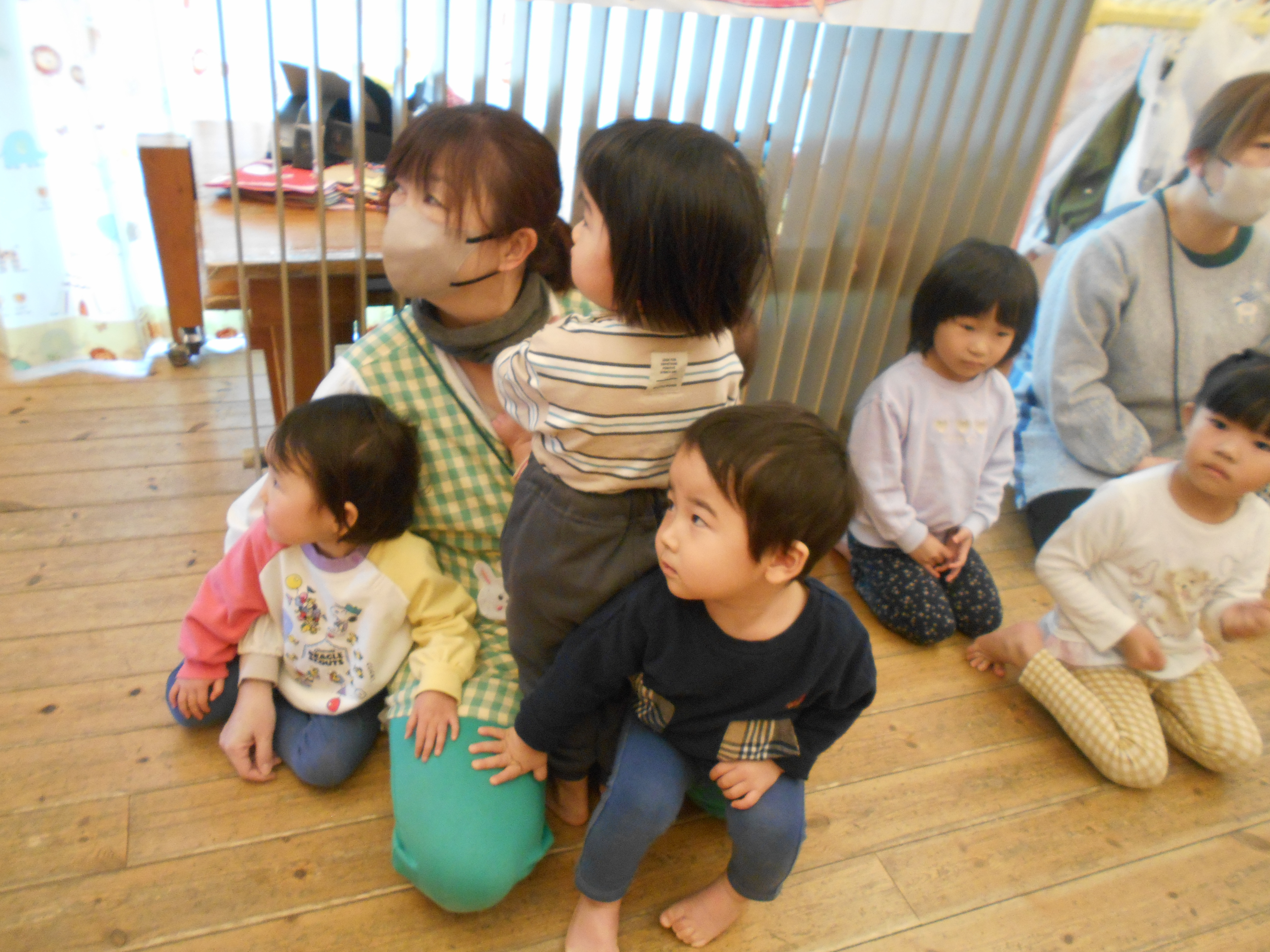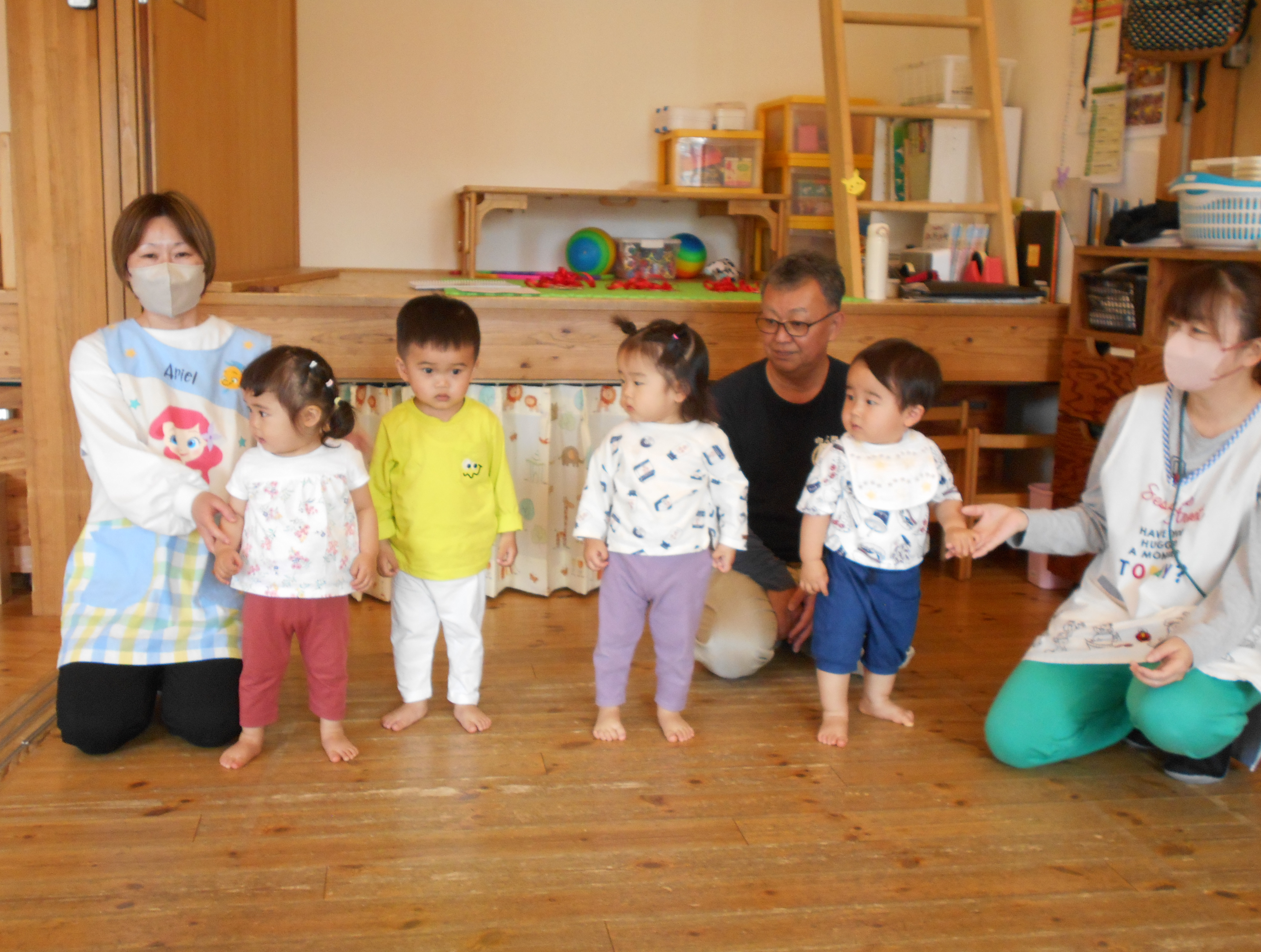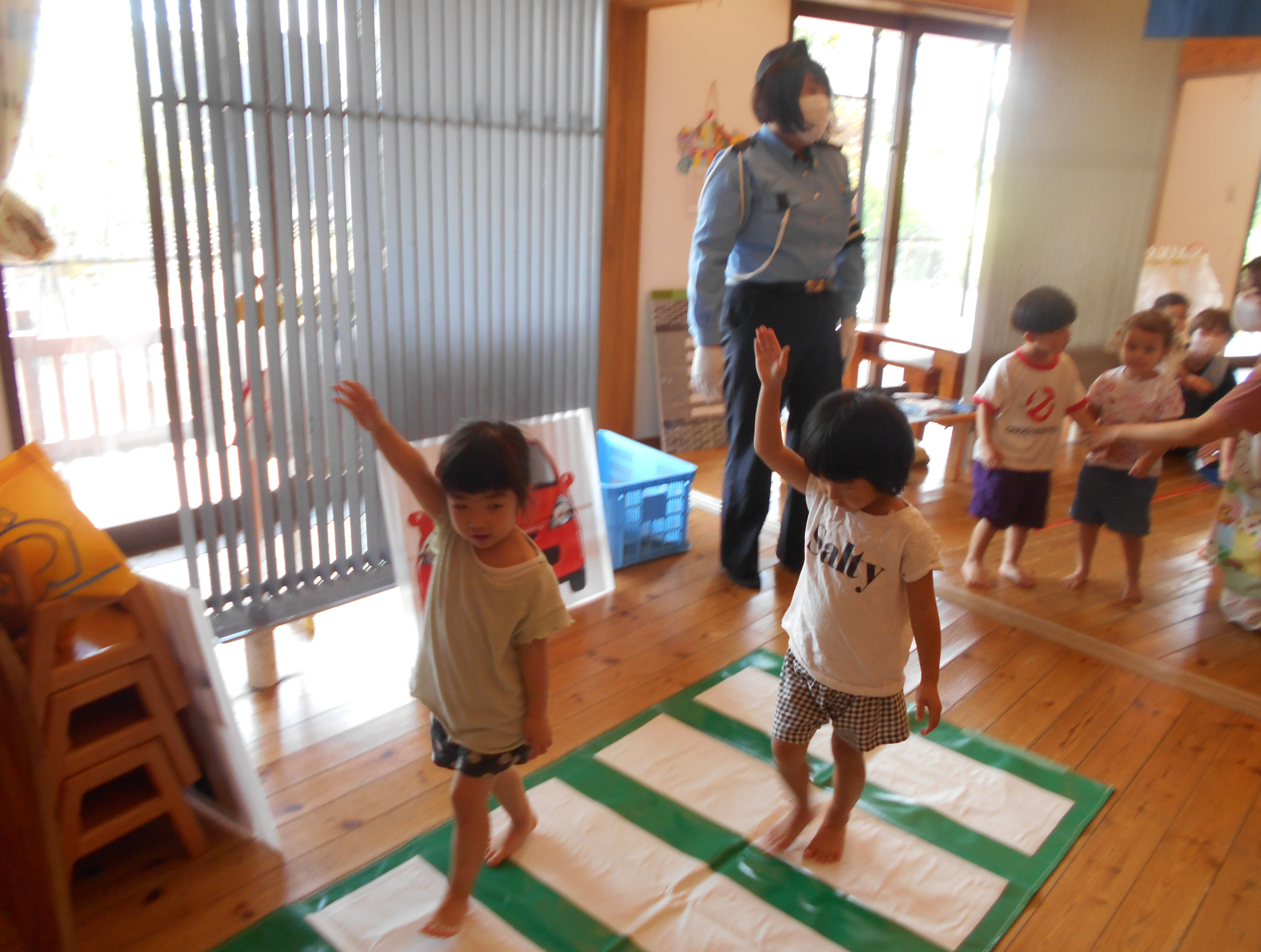 交通安全教室②保育室内で手を挙げてわたる練習! |