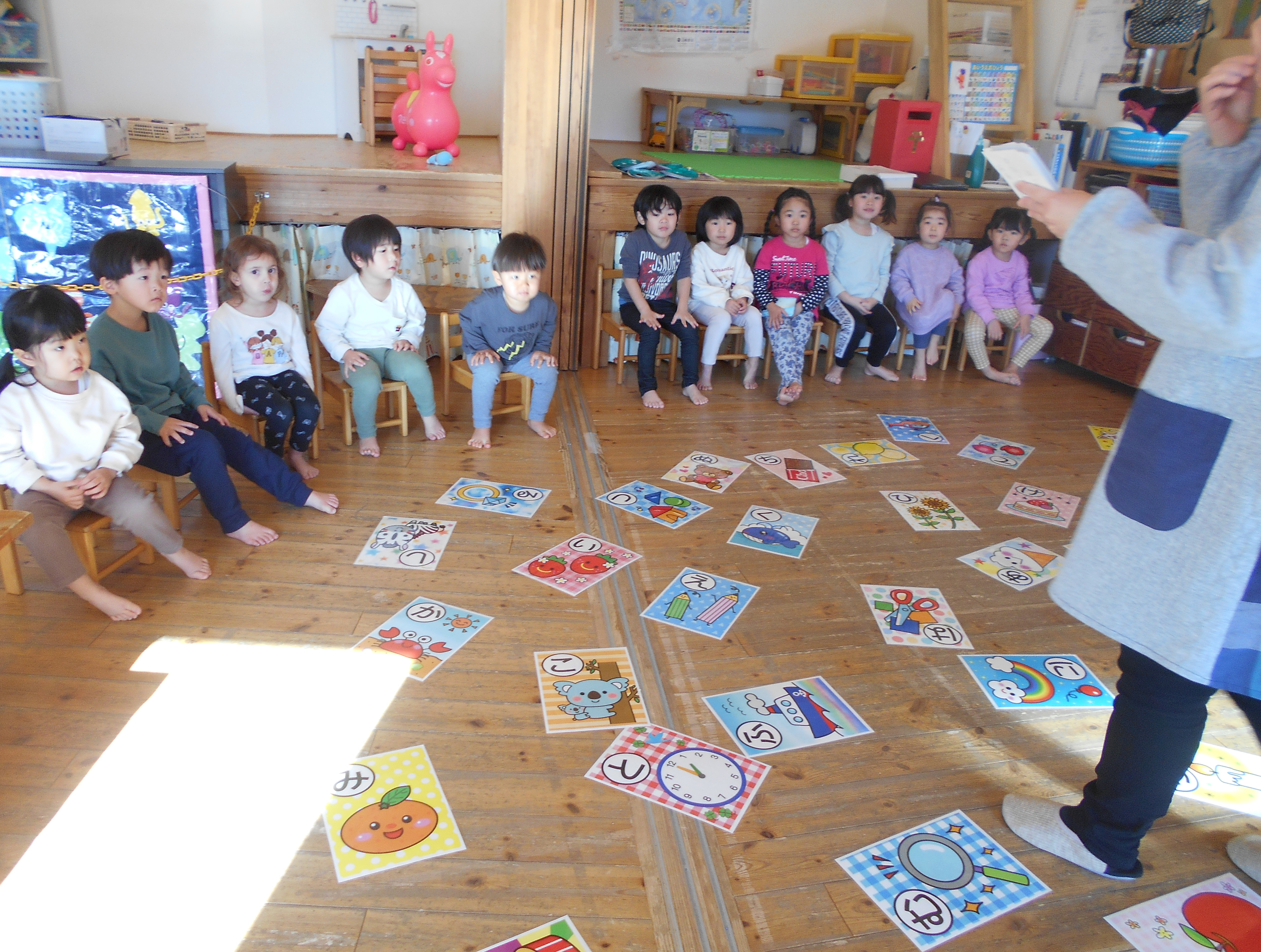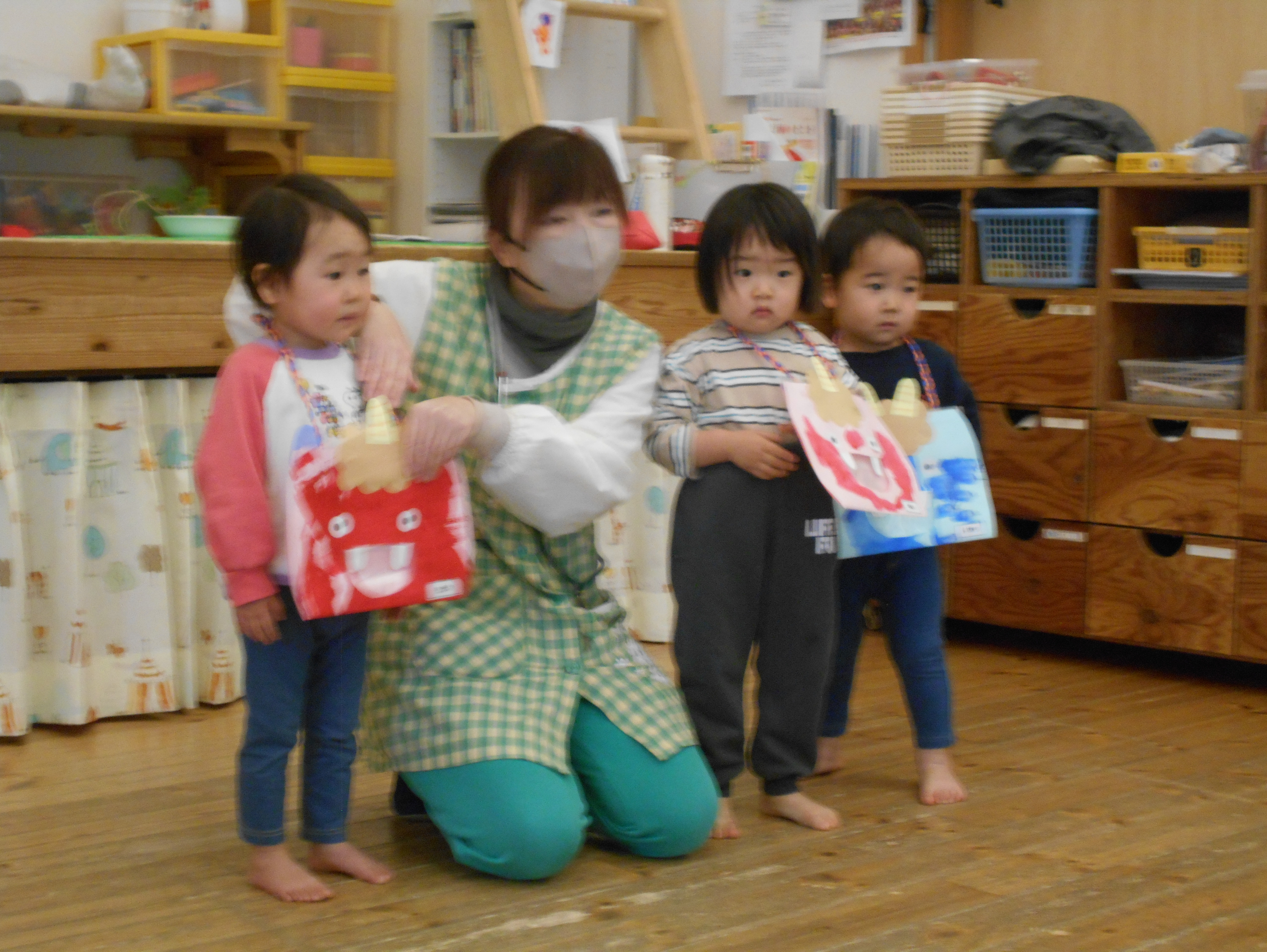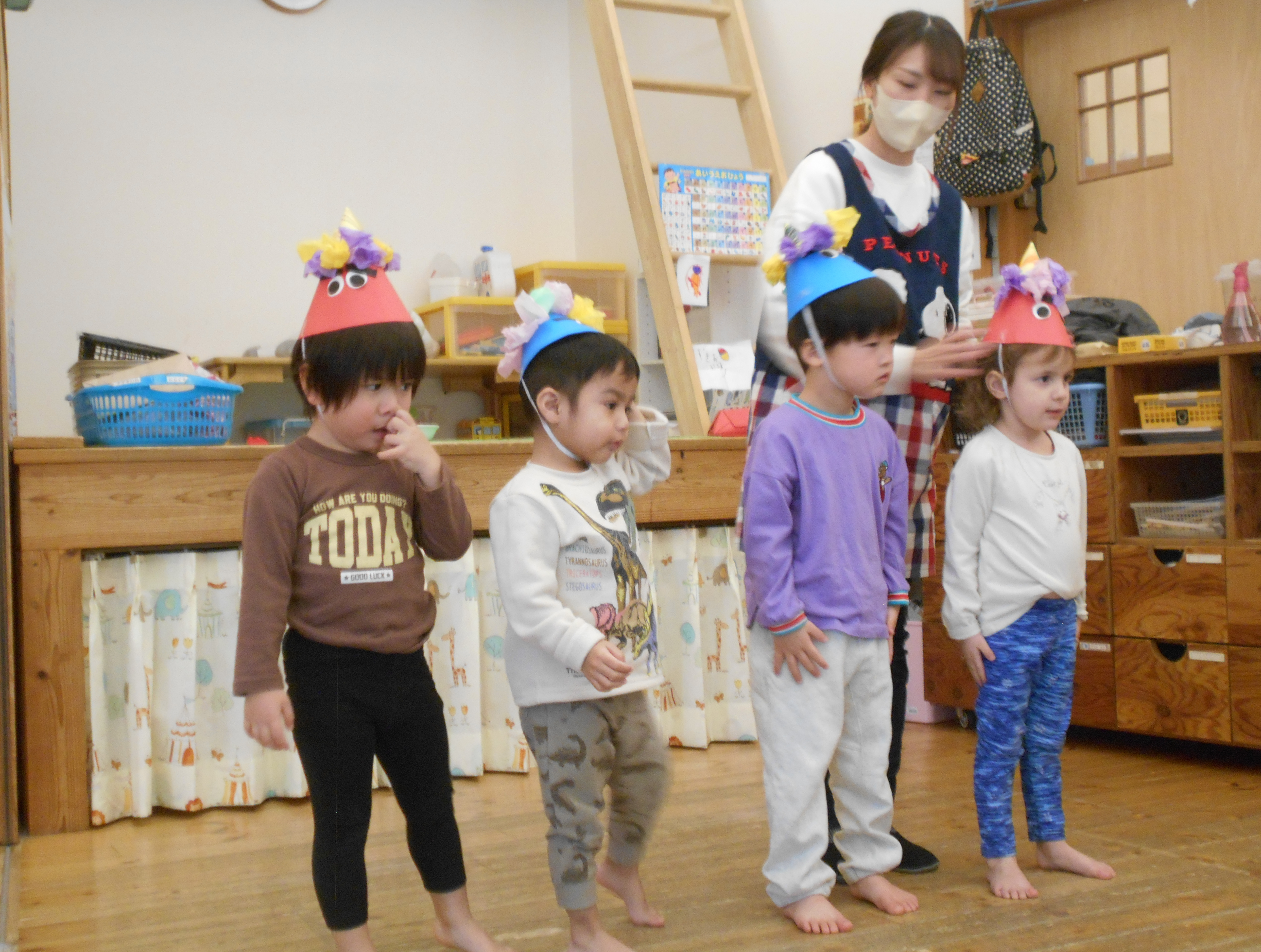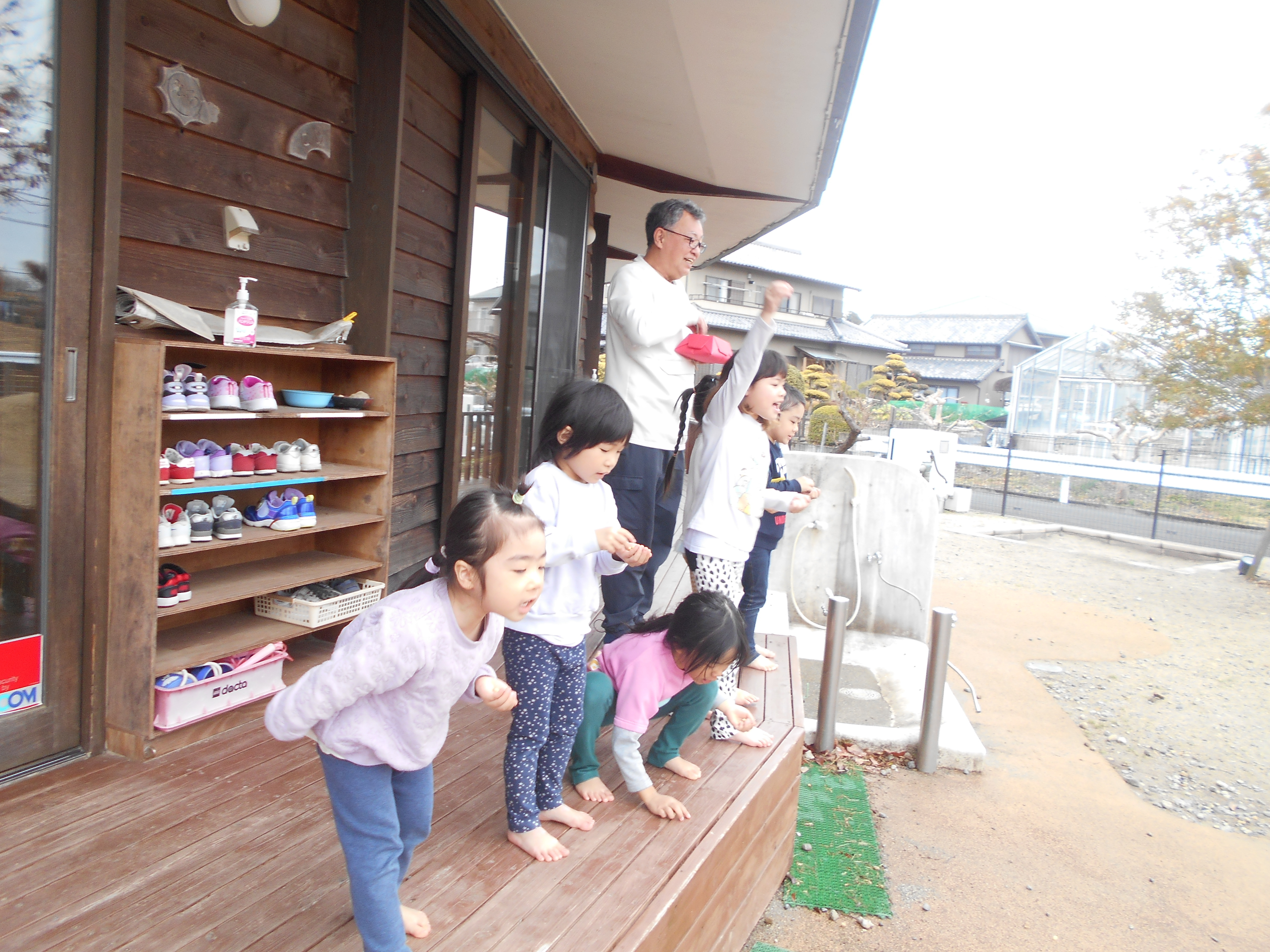 交通安全教室②保育室内で手を挙げてわたる練習! |