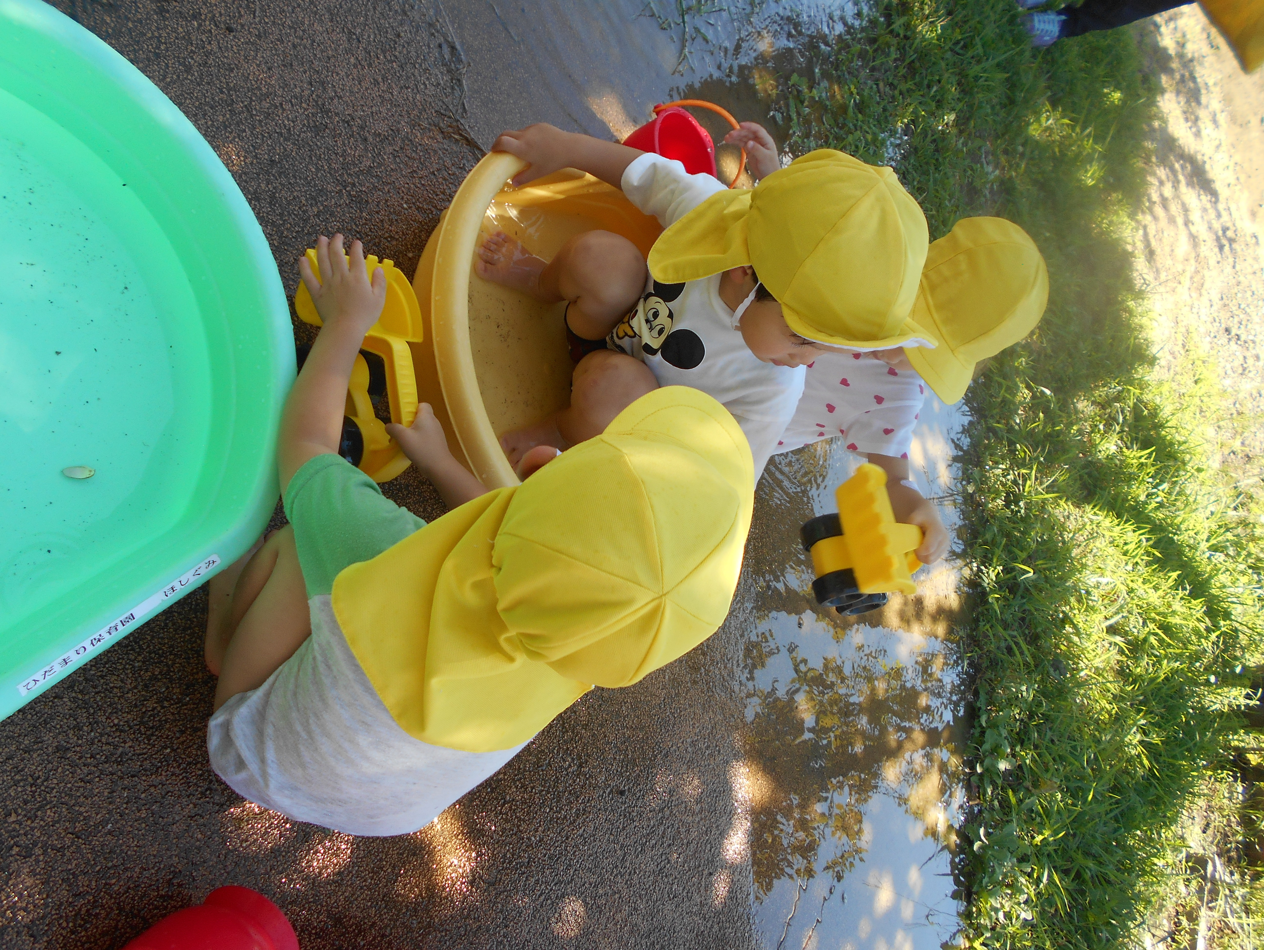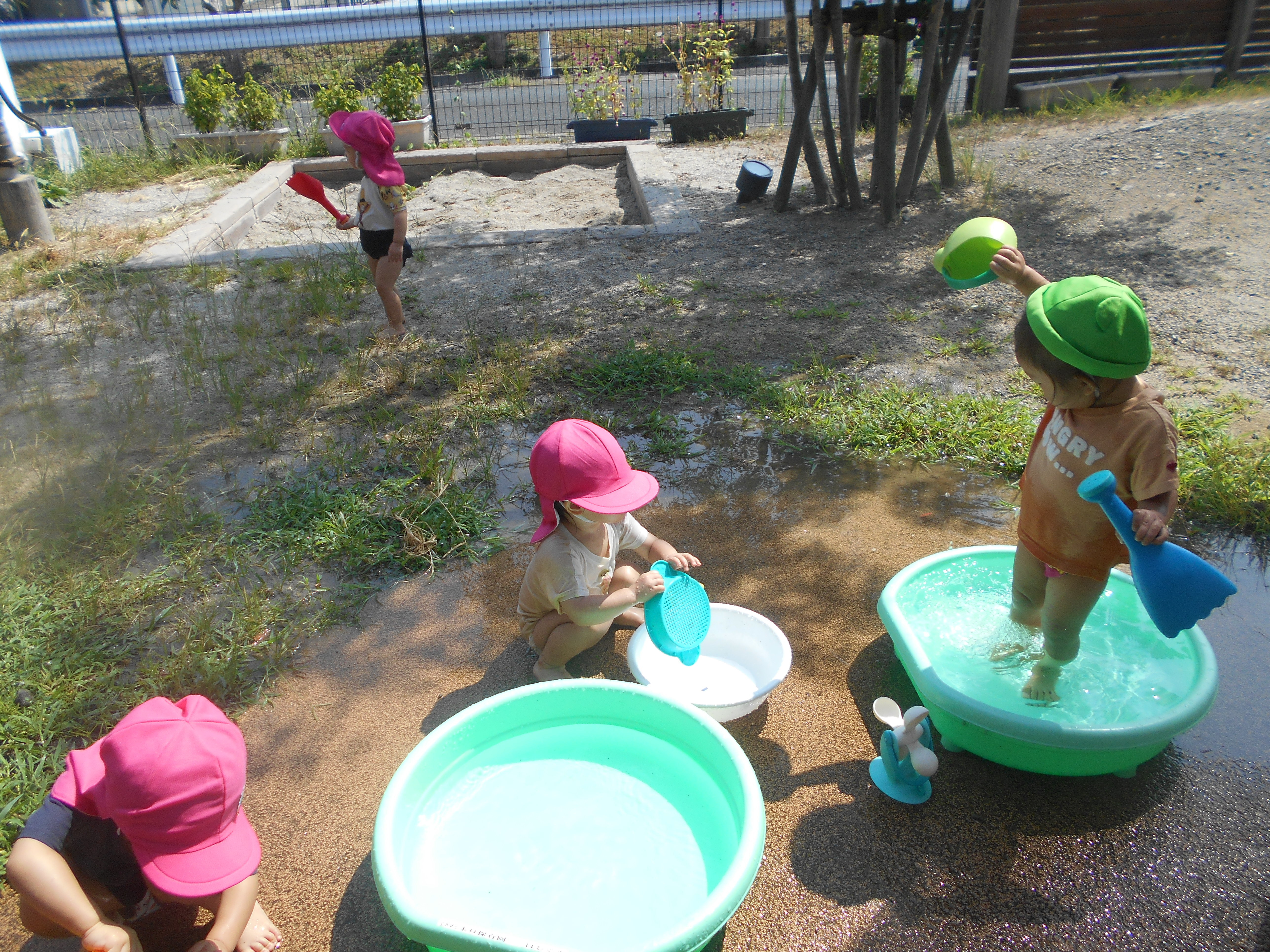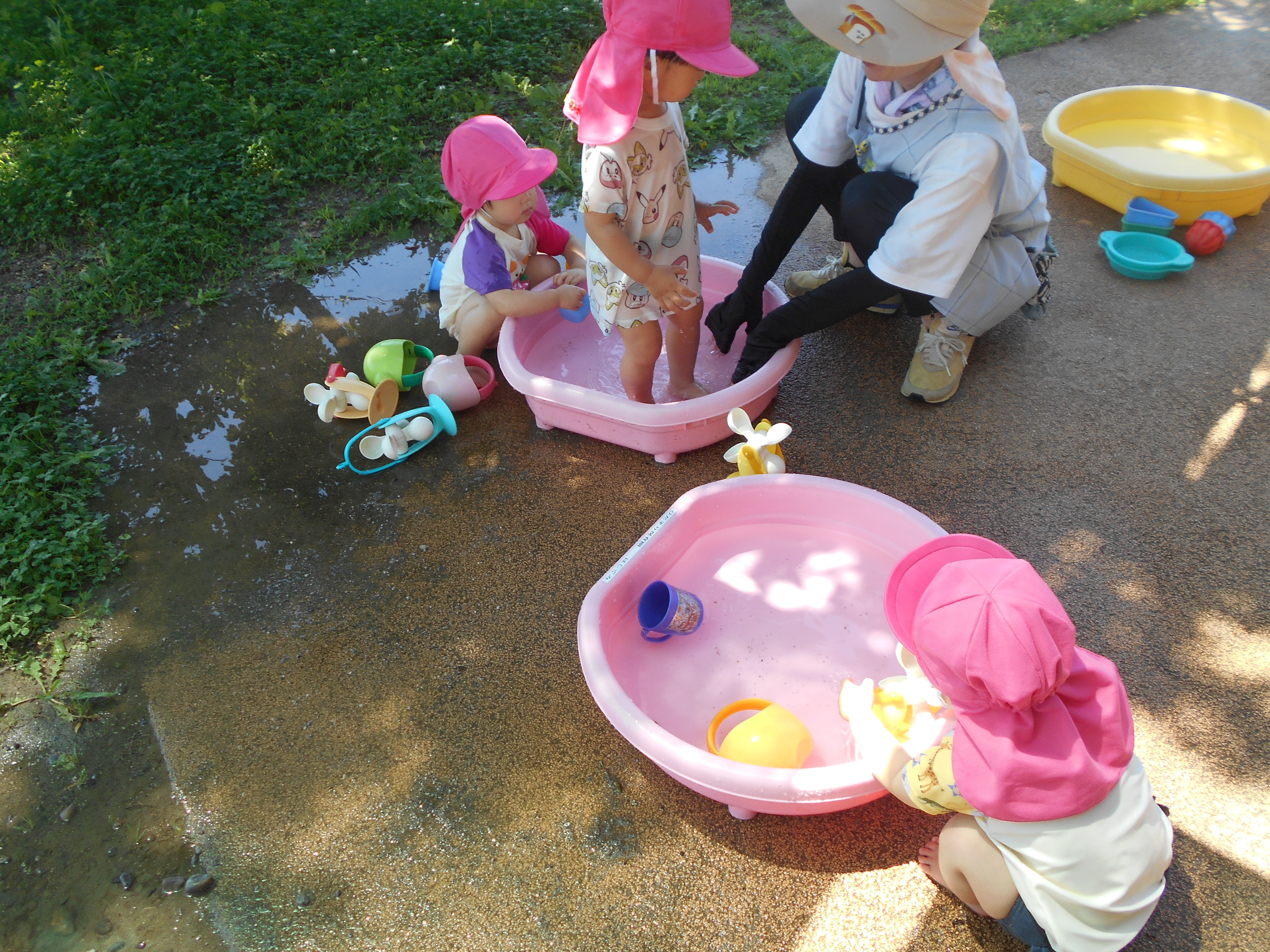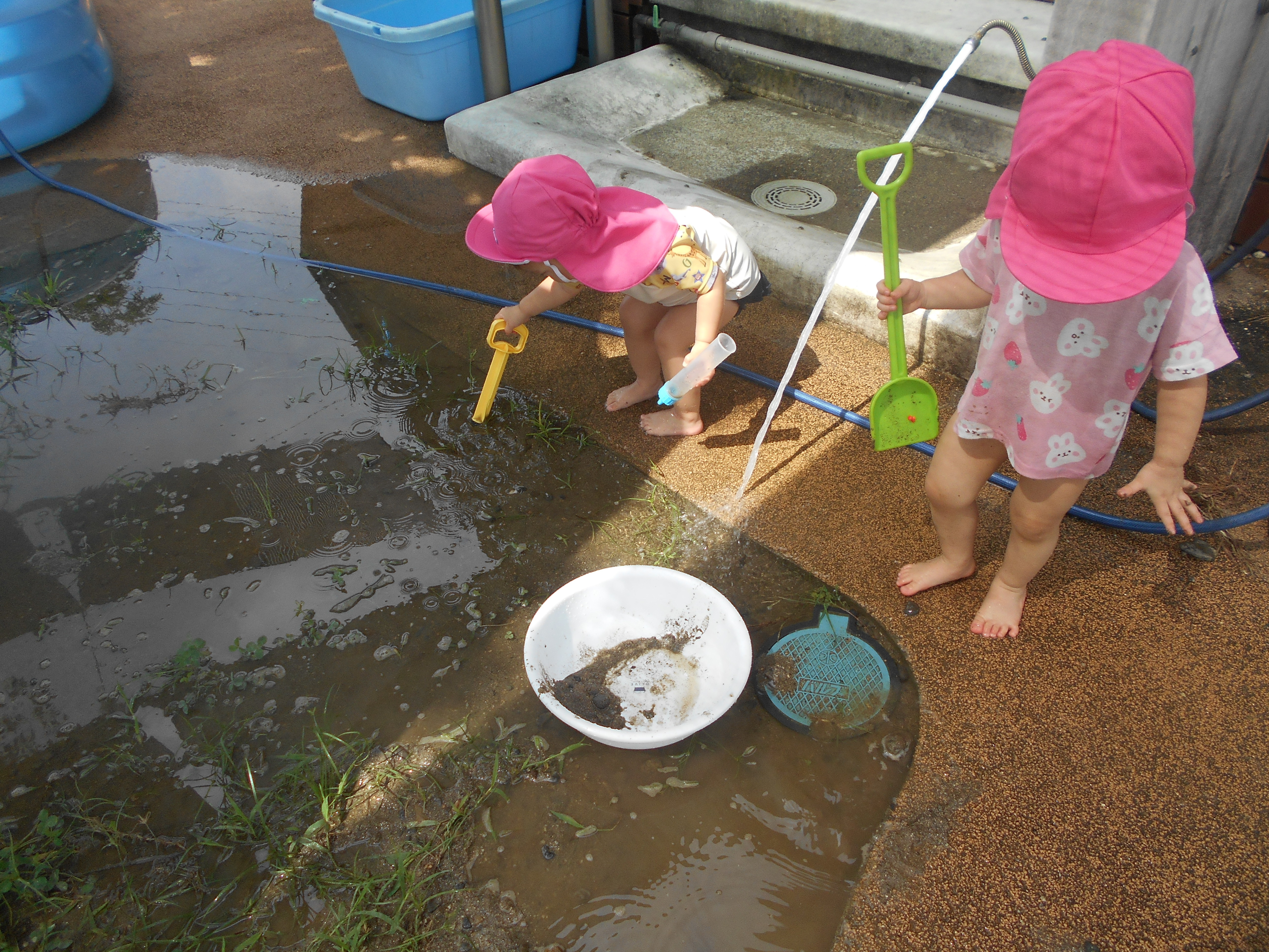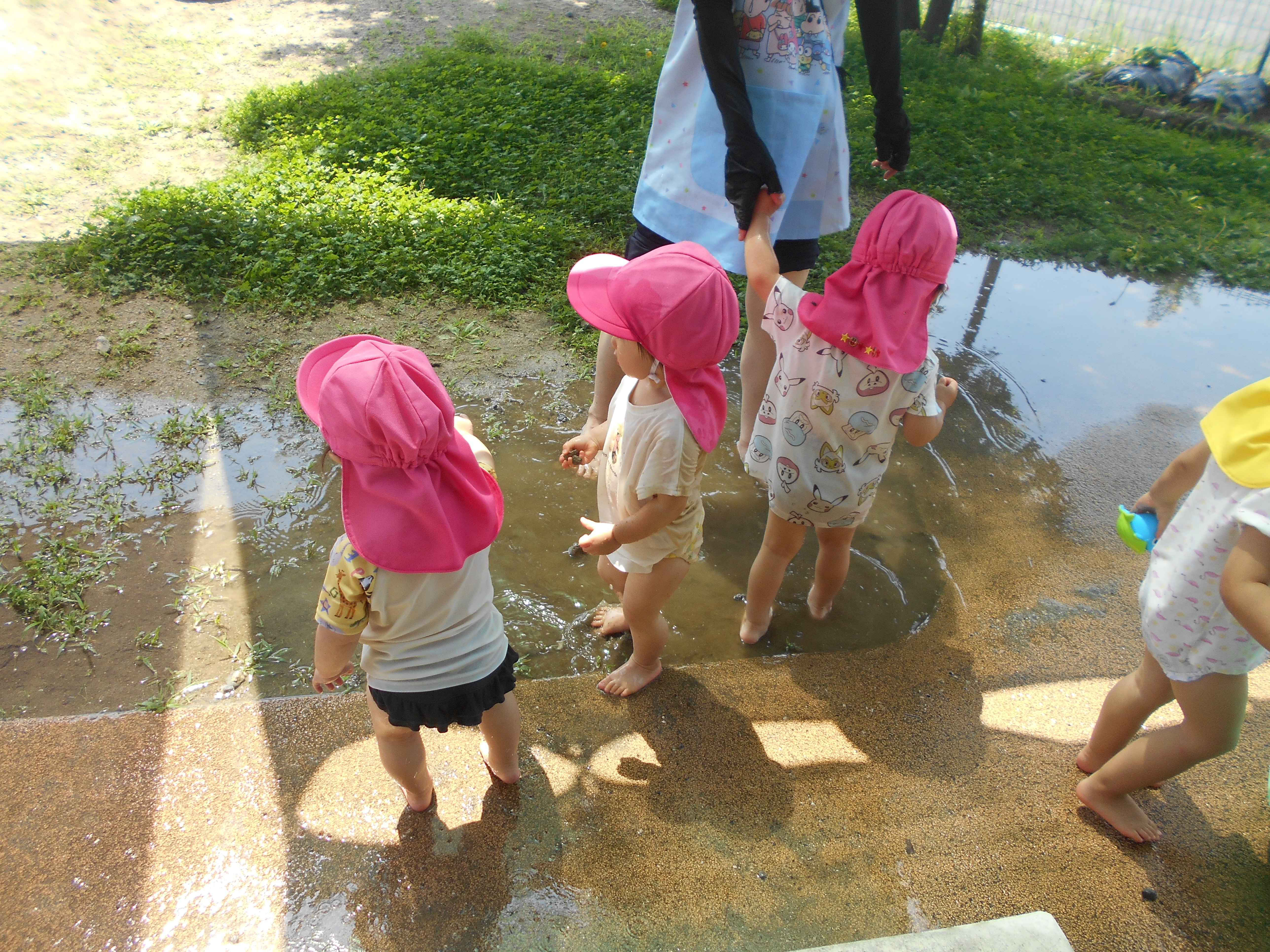 ほし・つき組水遊び、泥んこ遊びを楽しんで冷たさや感触を味わったほし・つき組のお友だち😊 |
