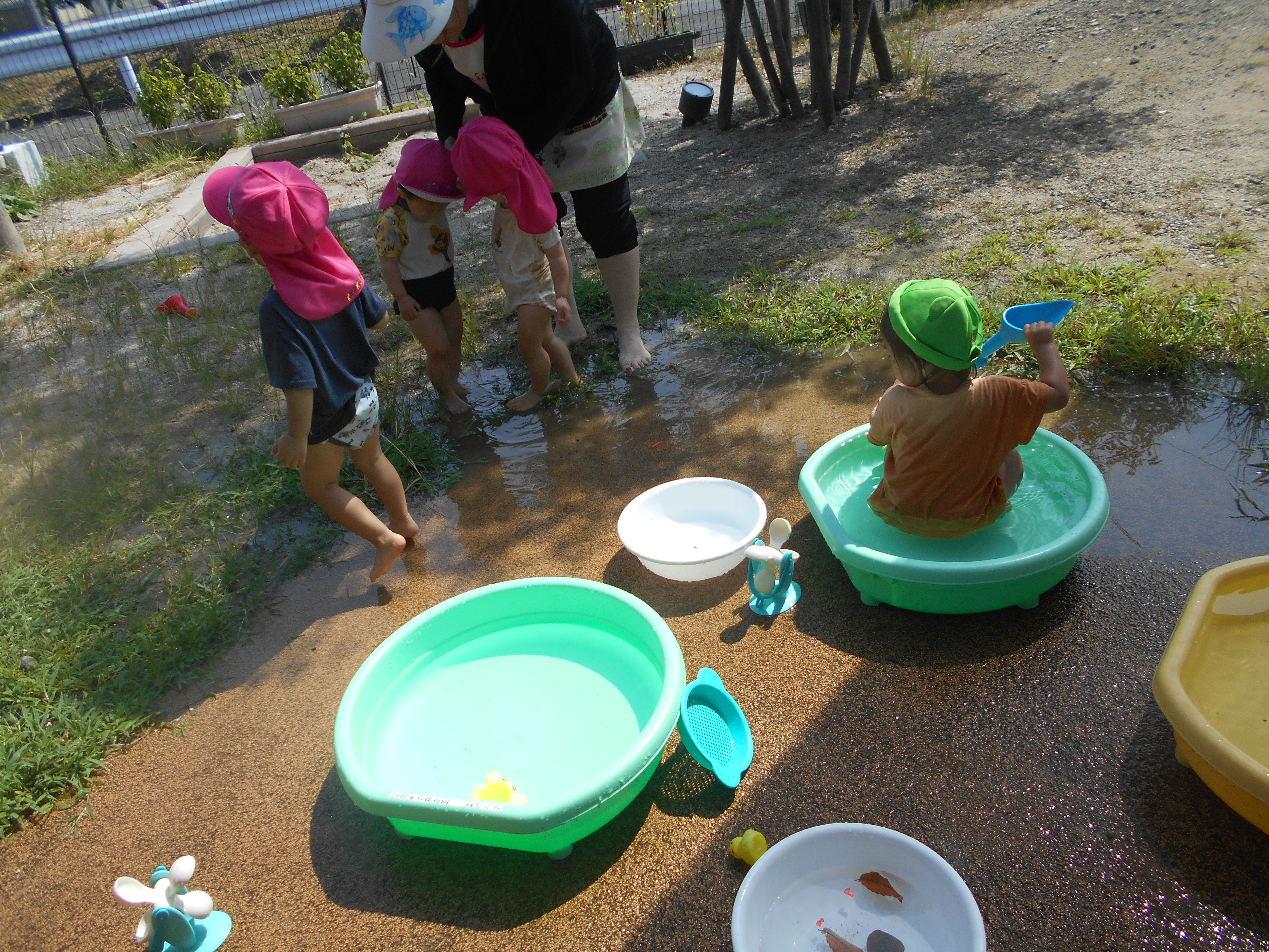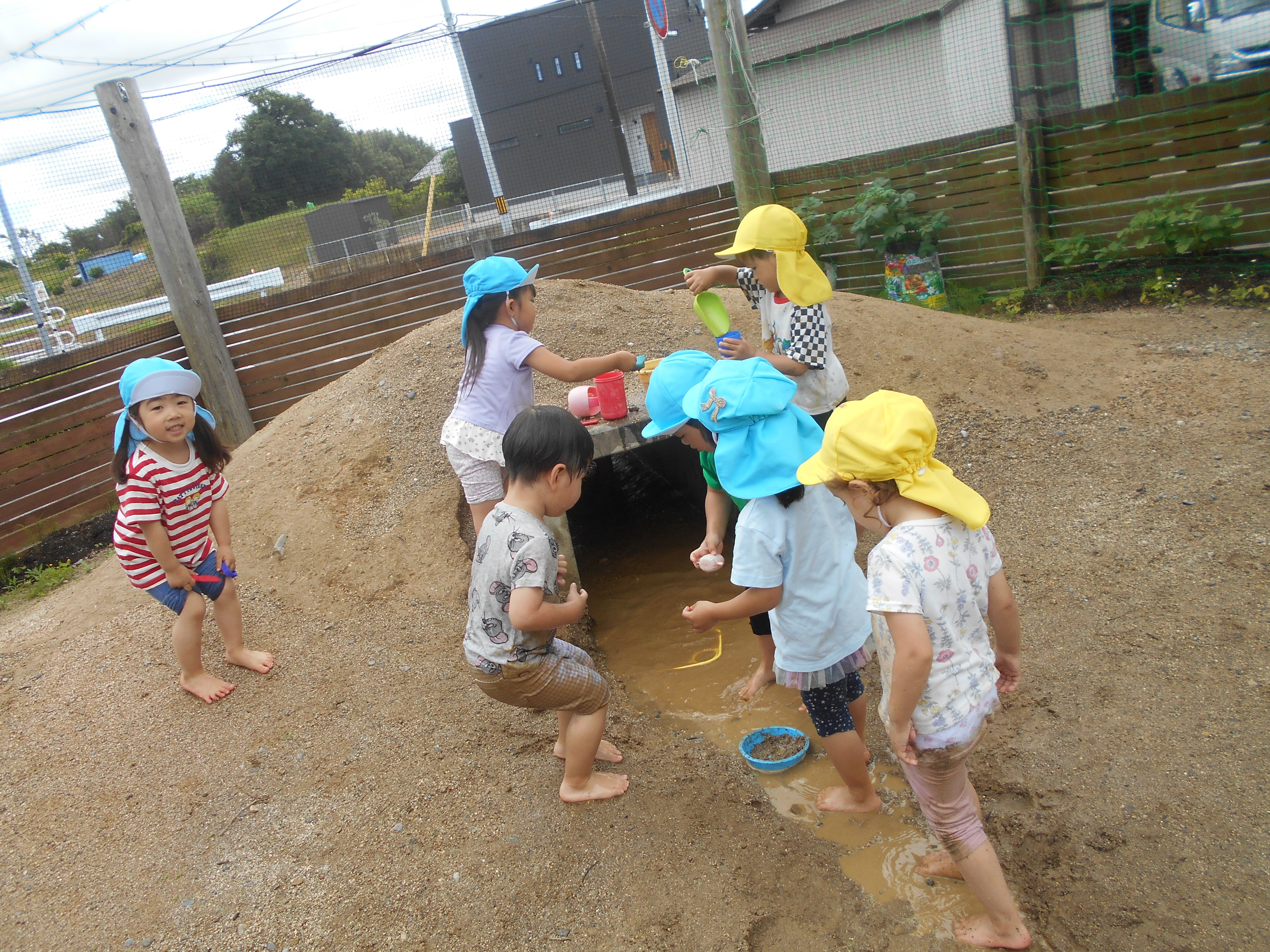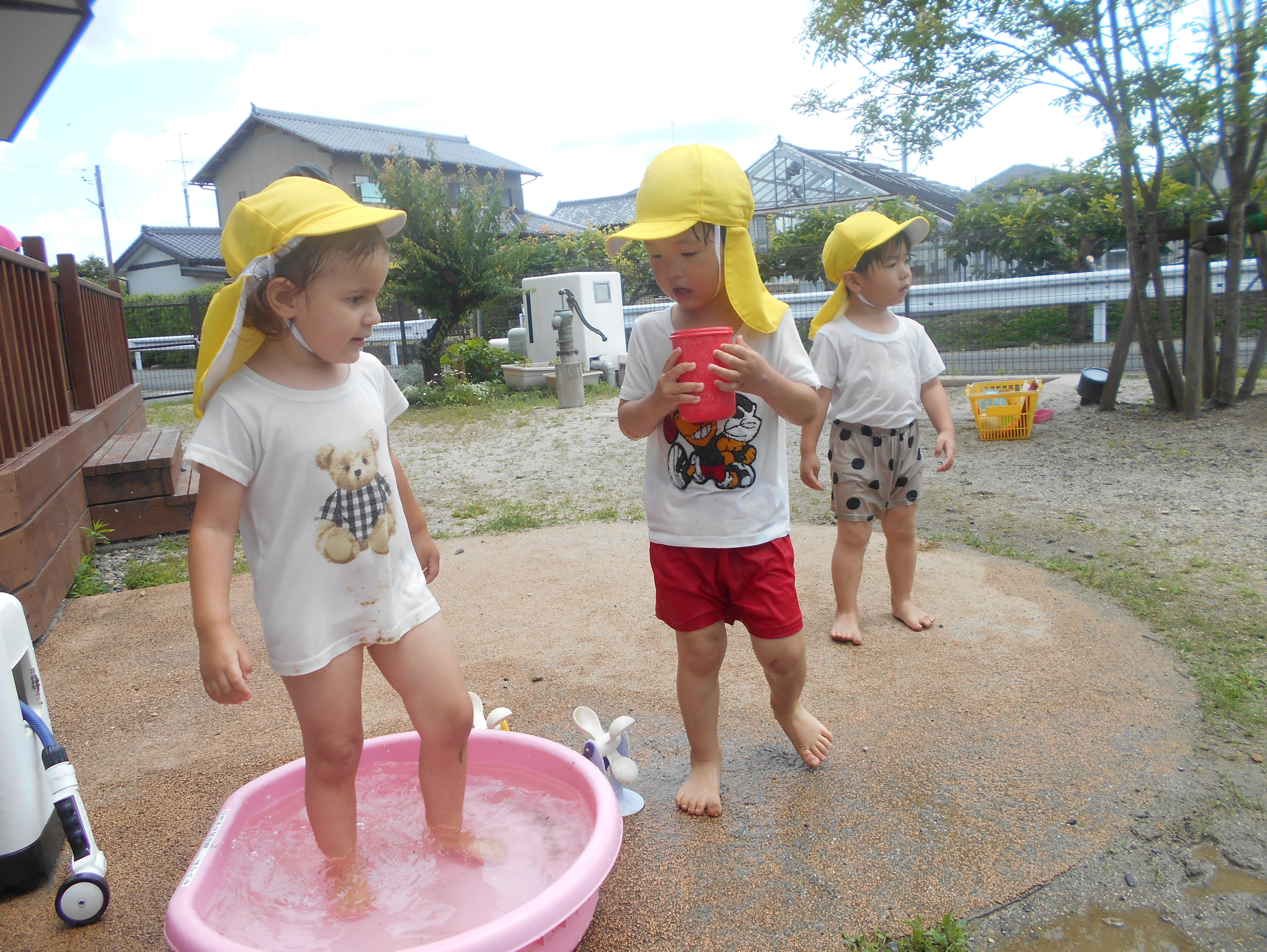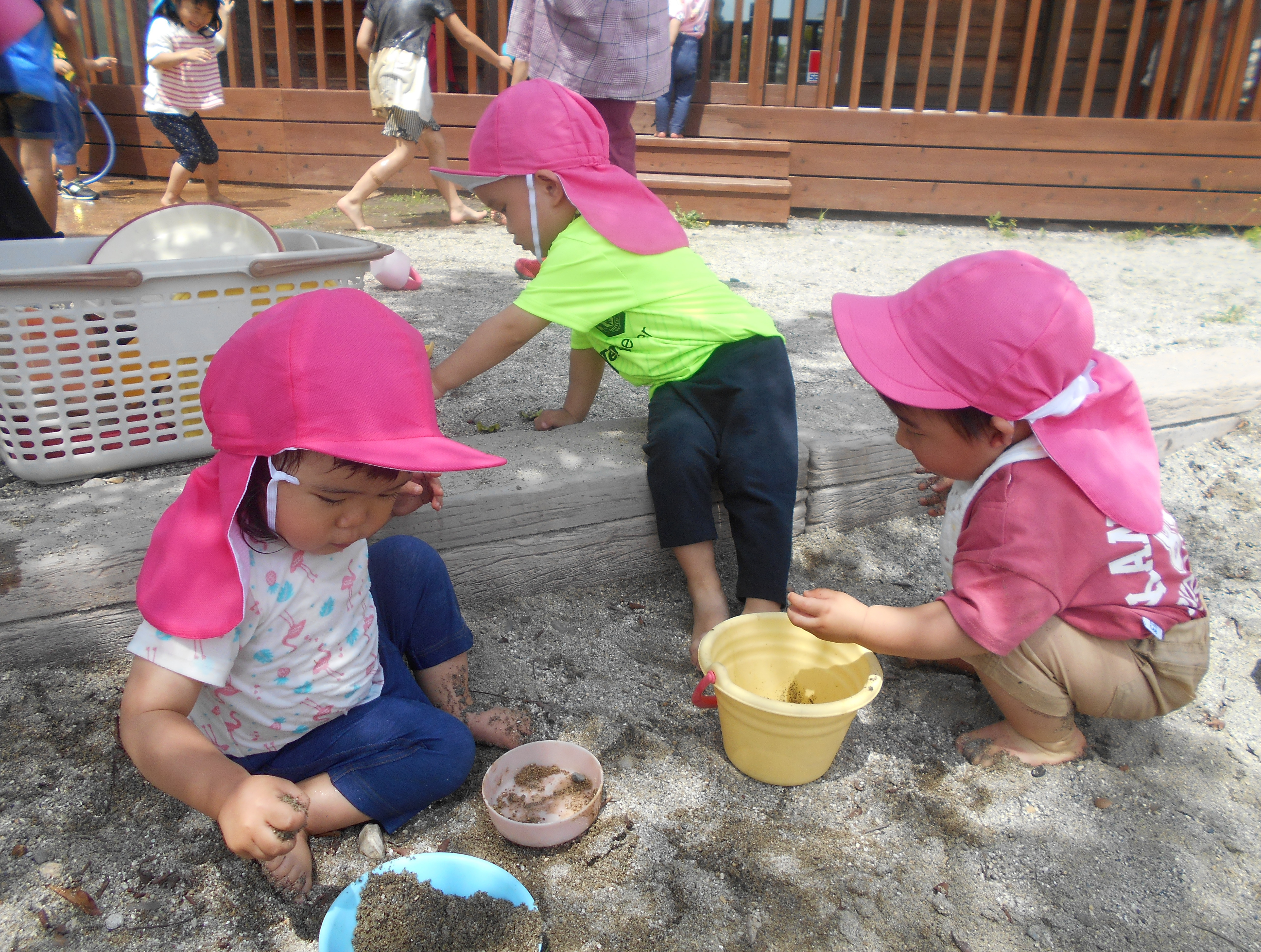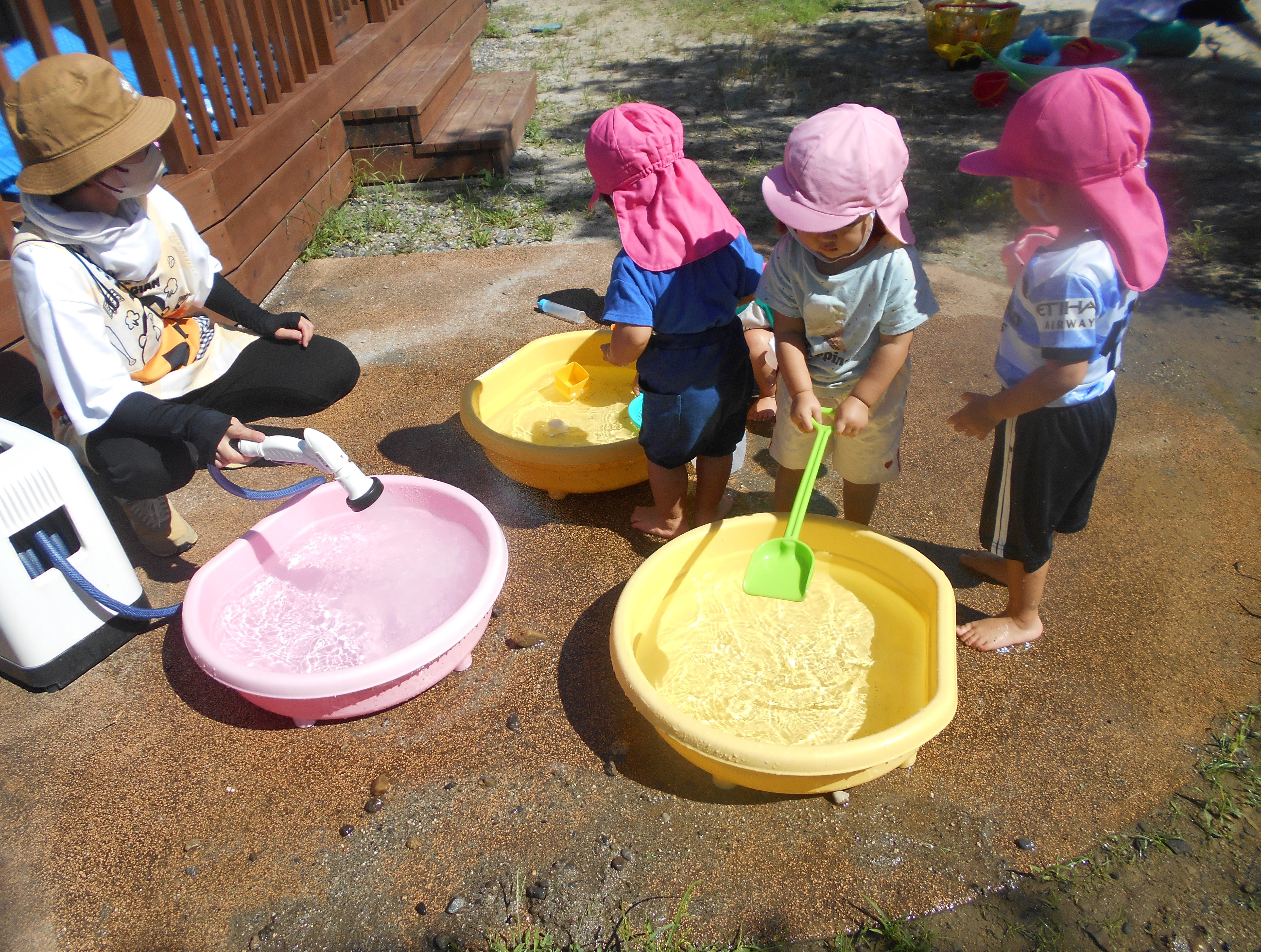 ほし・つき組水遊び、泥んこ遊びを楽しんで冷たさや感触を味わったほし・つき組のお友だち😊 |