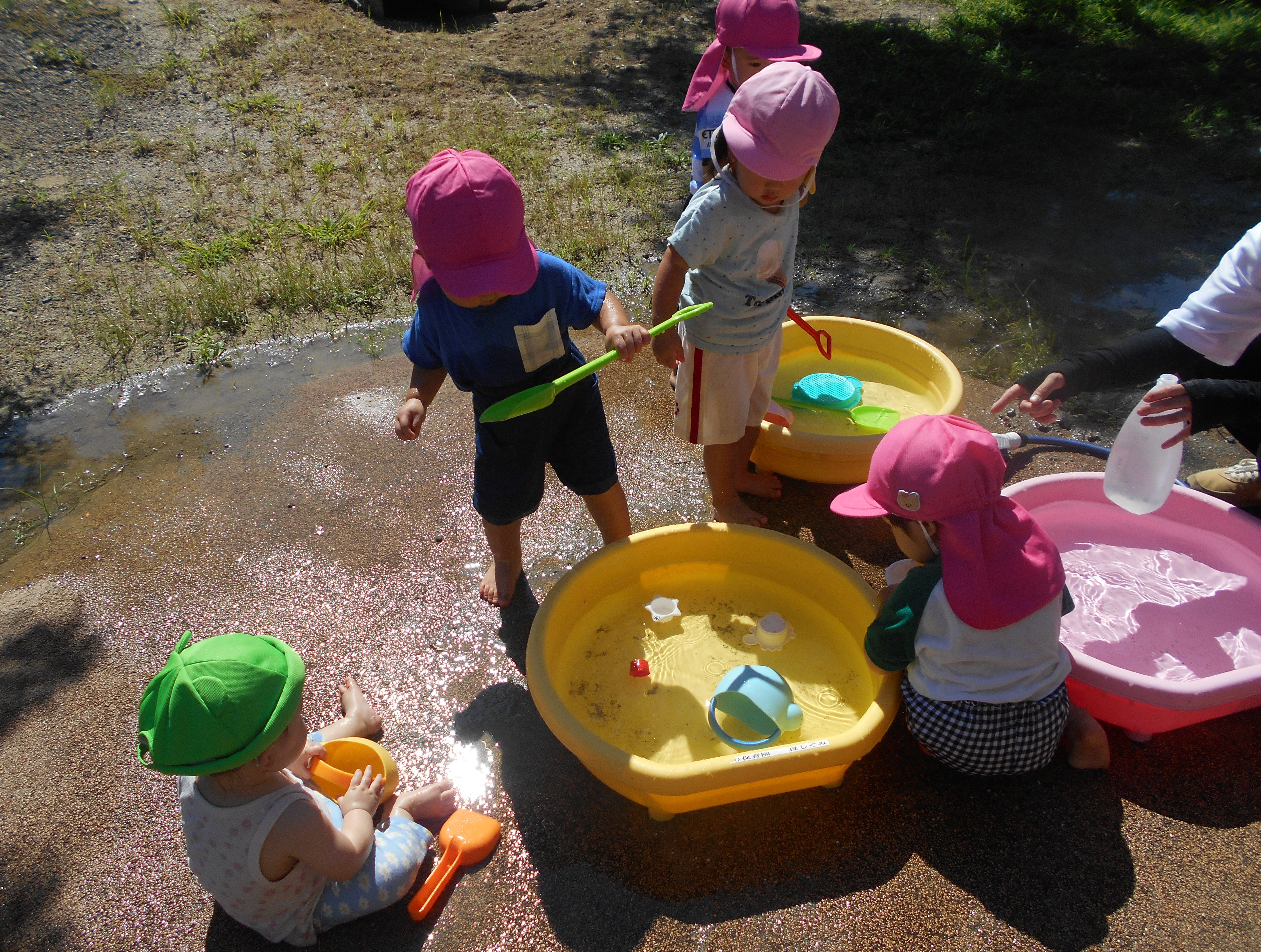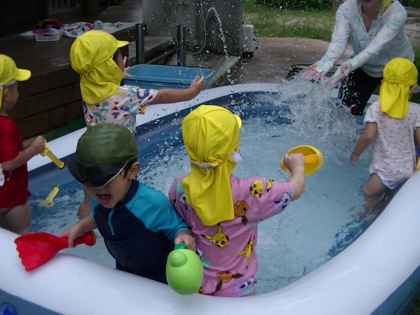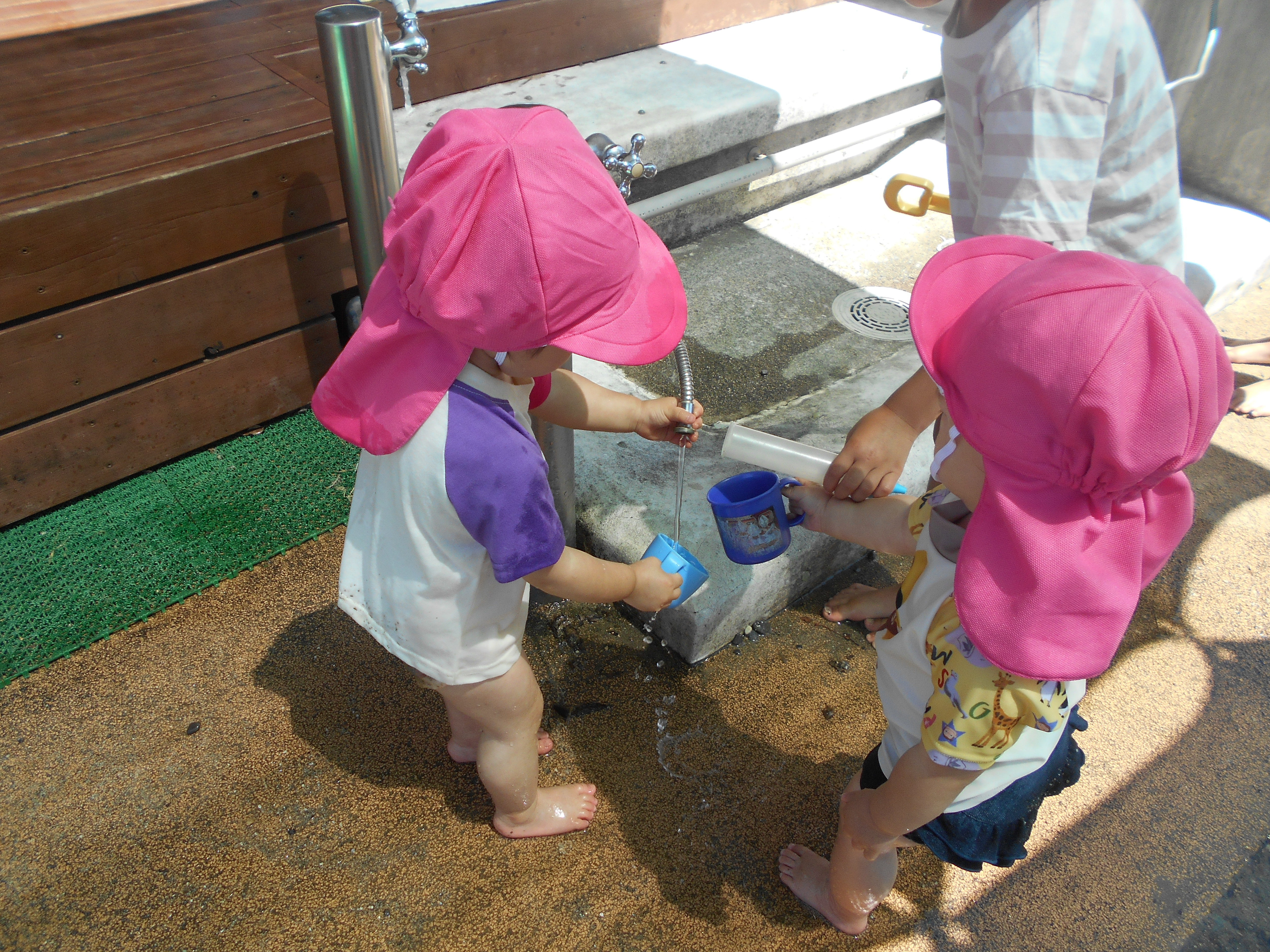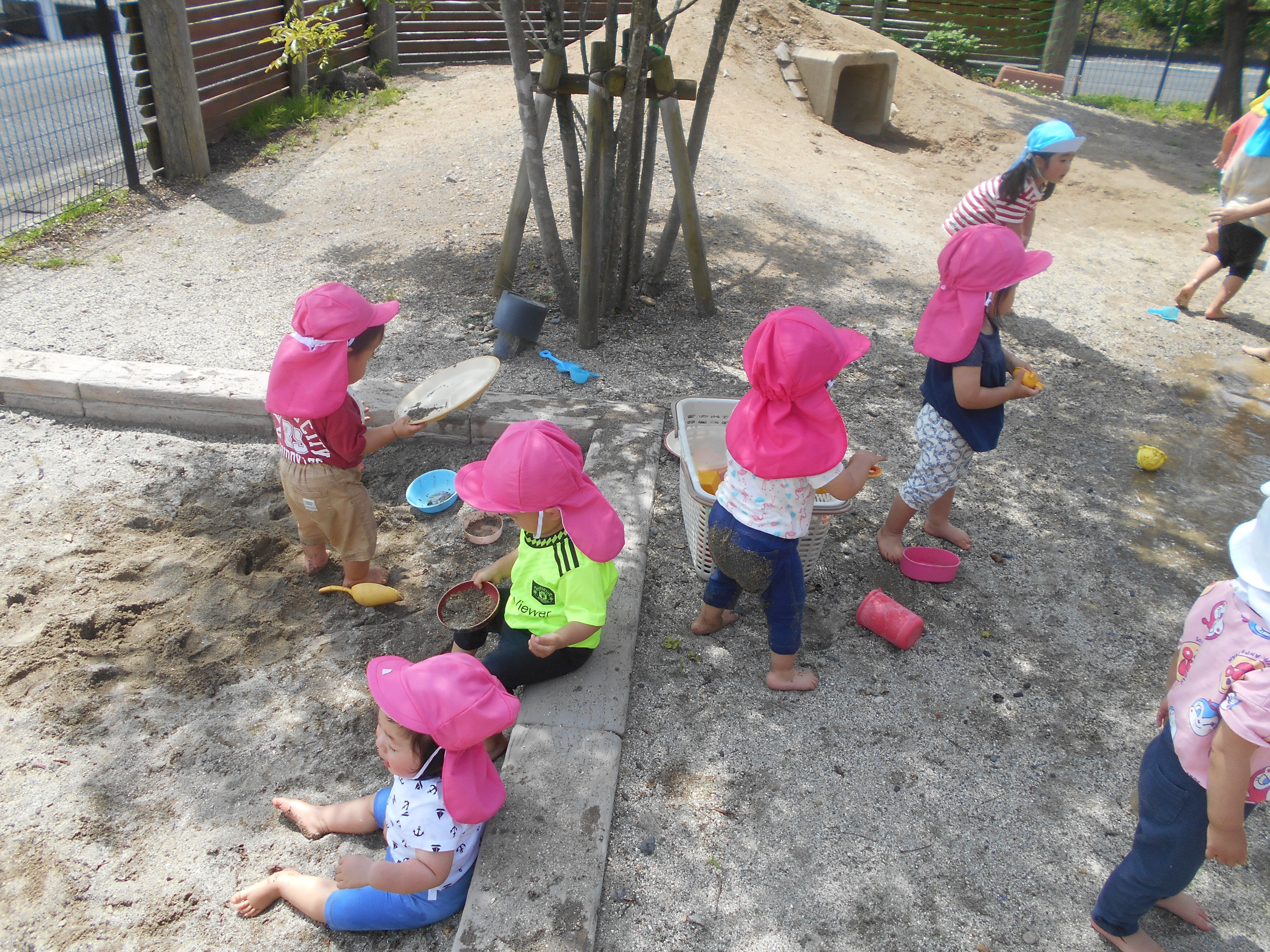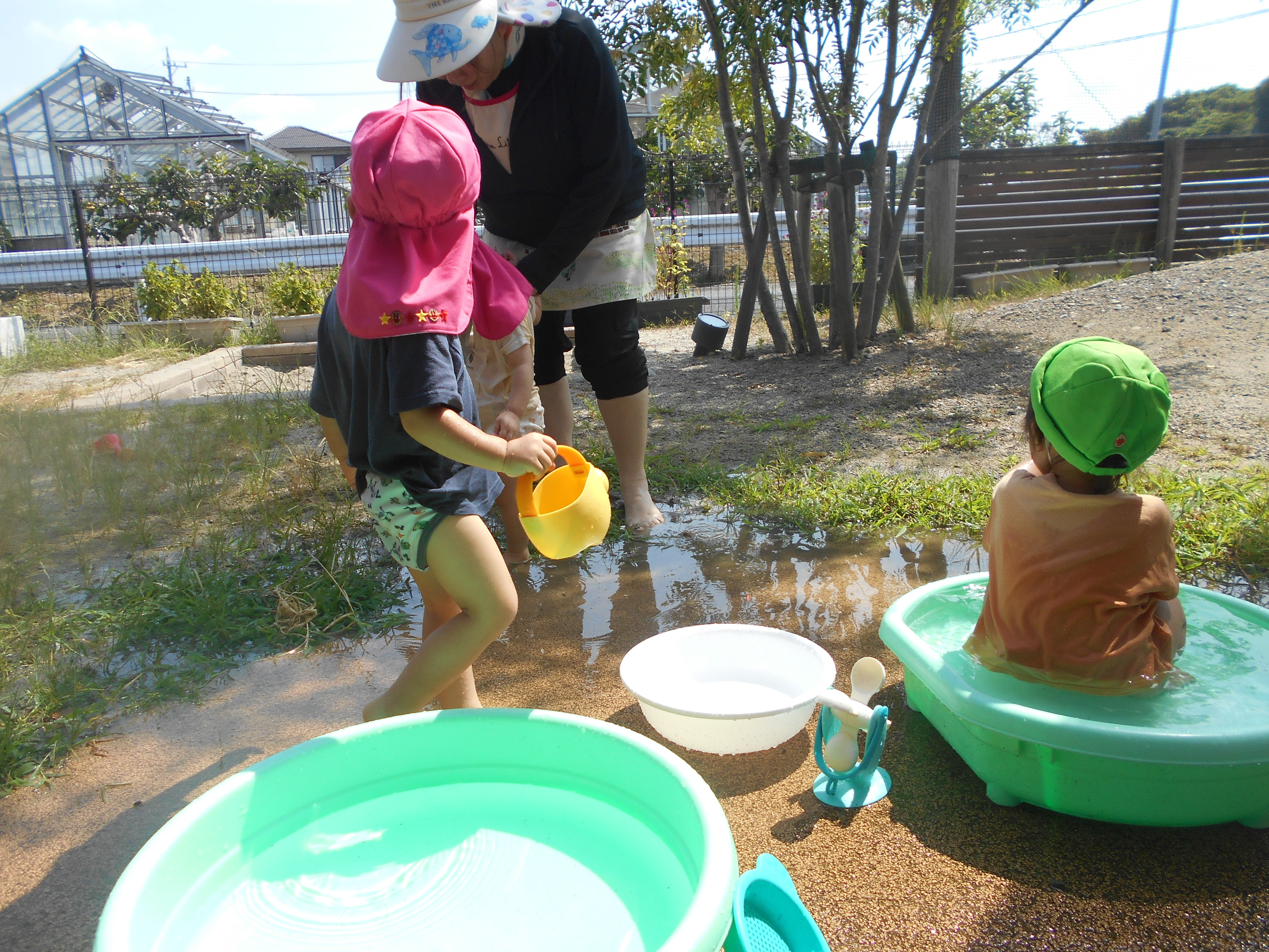 ほし・つき組水遊び、泥んこ遊びを楽しんで冷たさや感触を味わったほし・つき組のお友だち😊 |