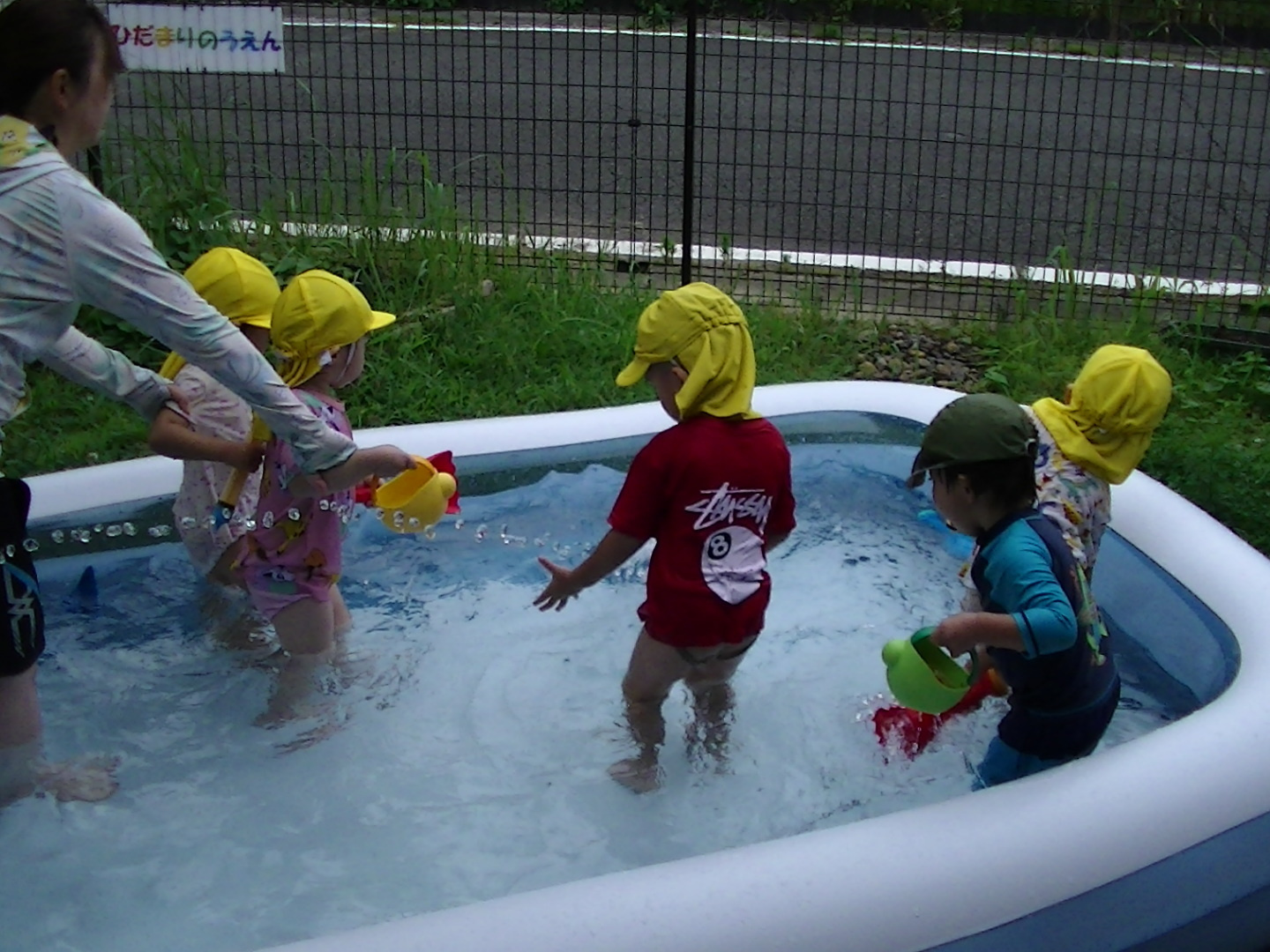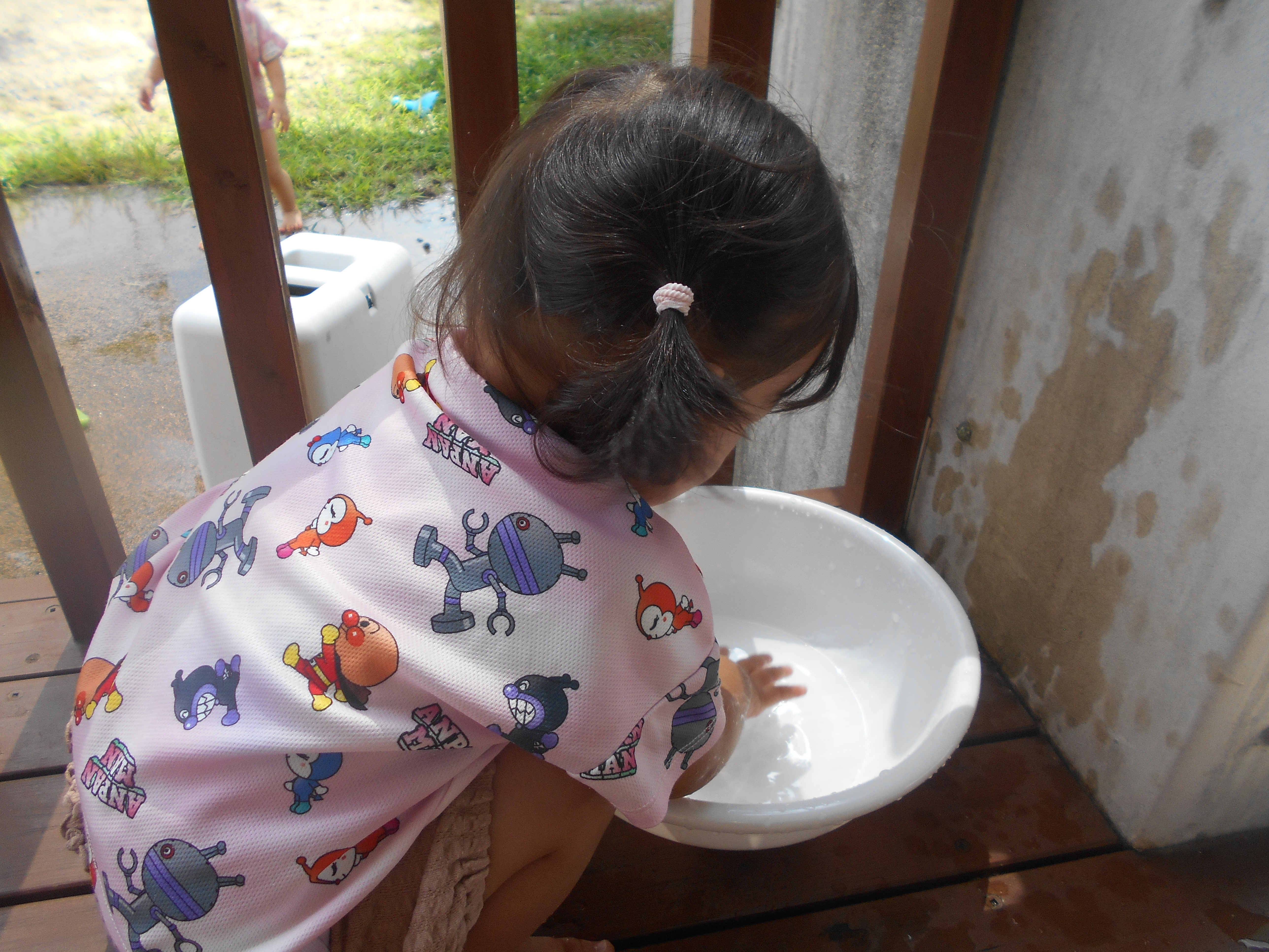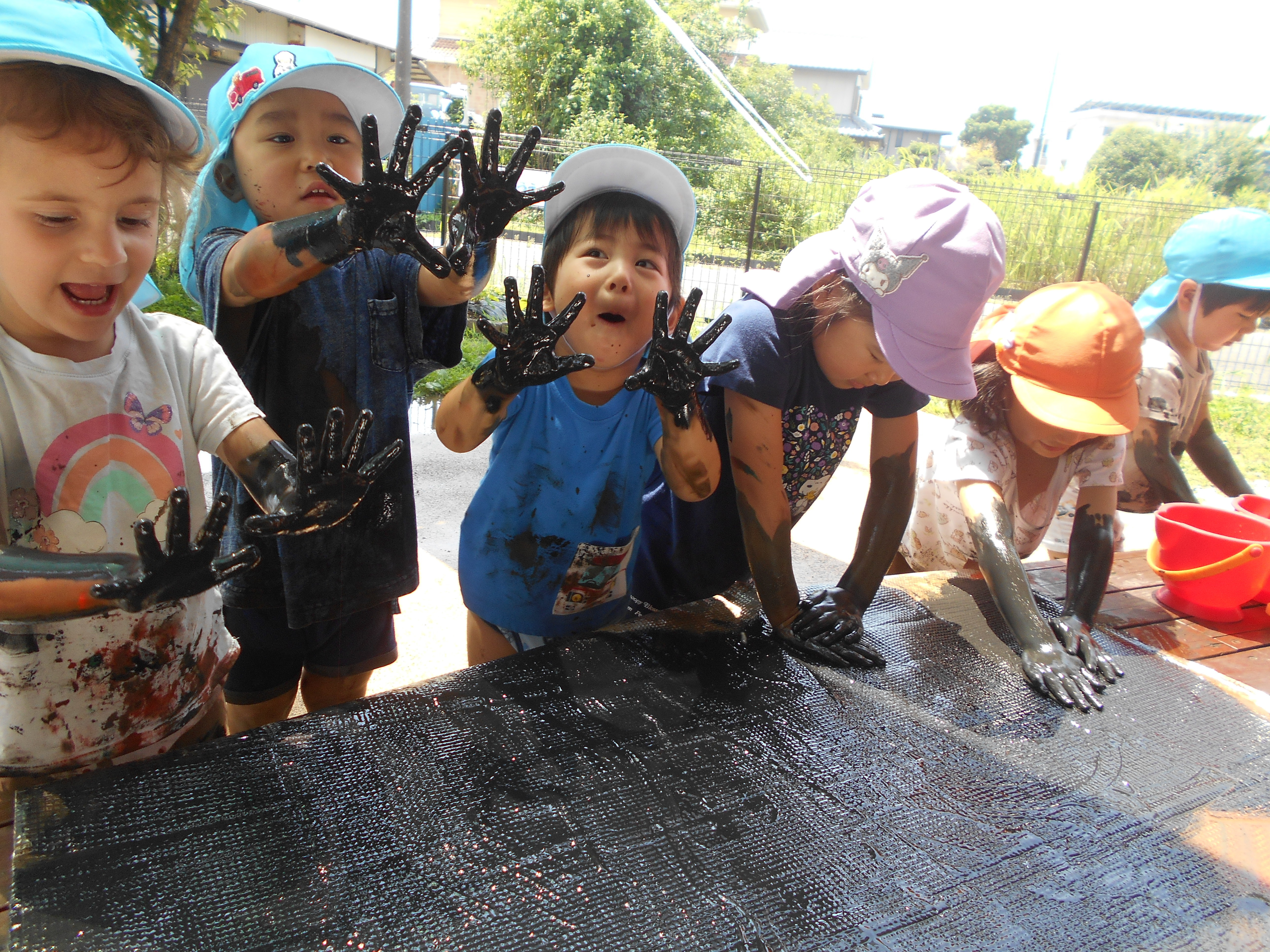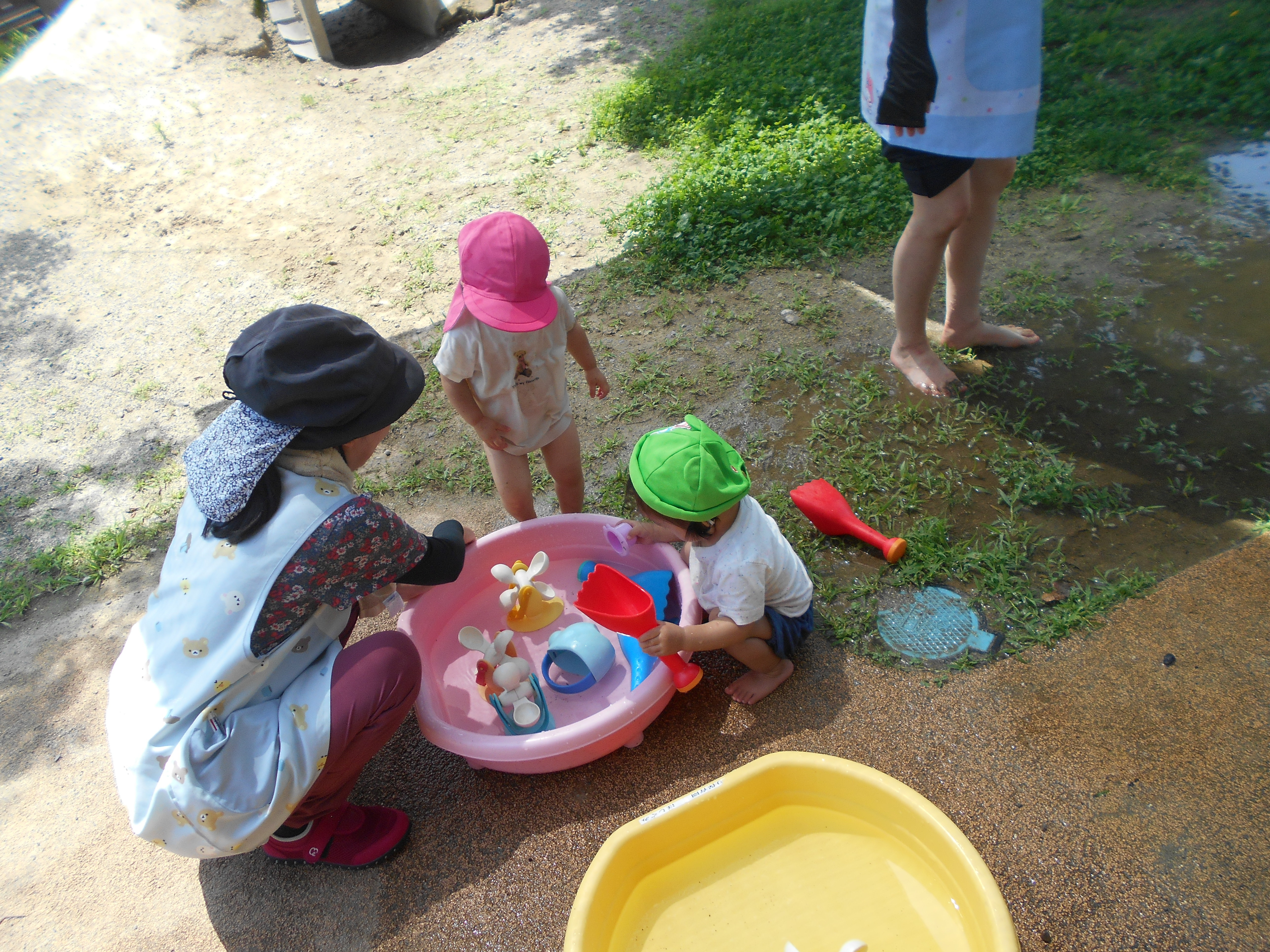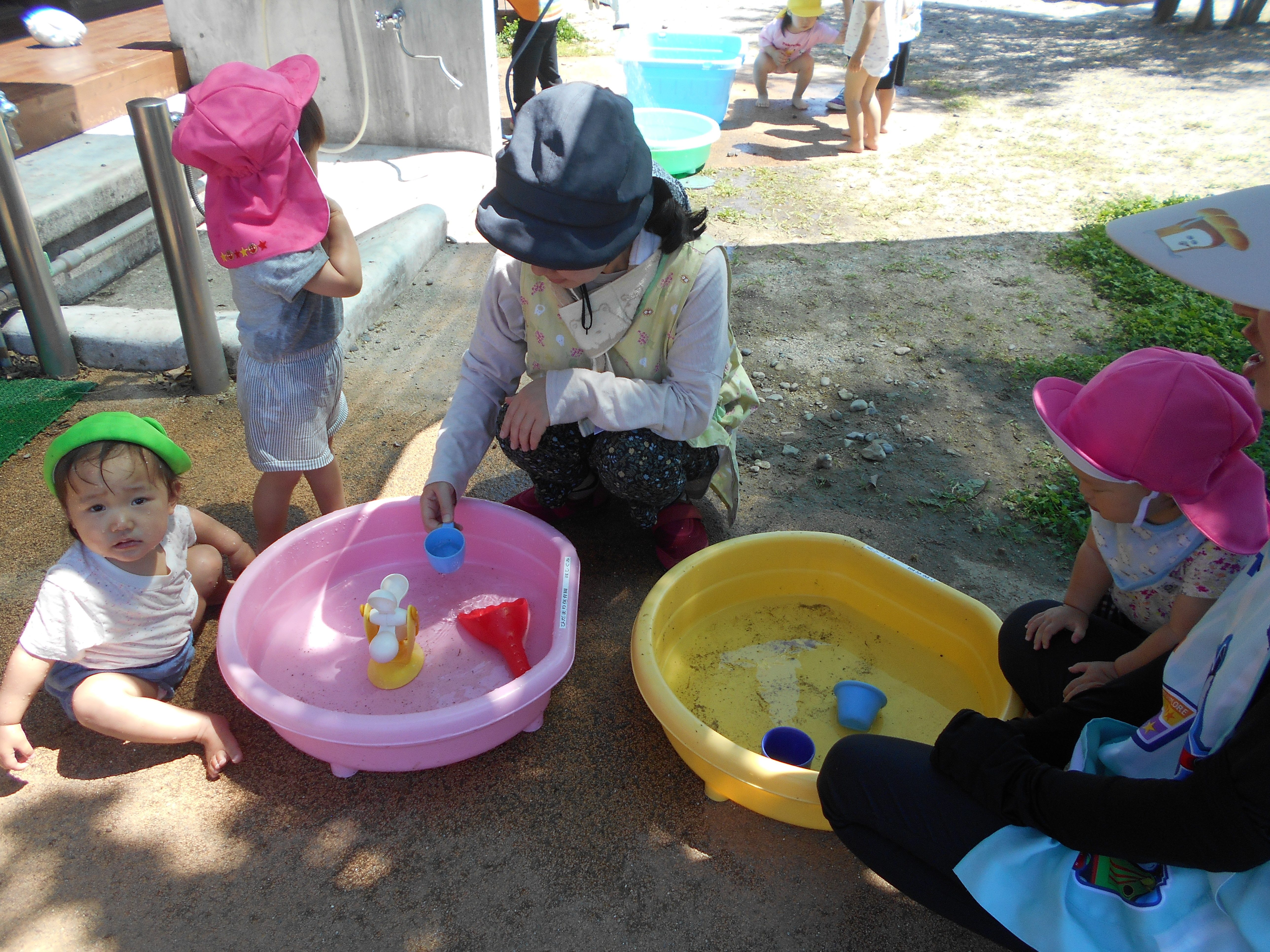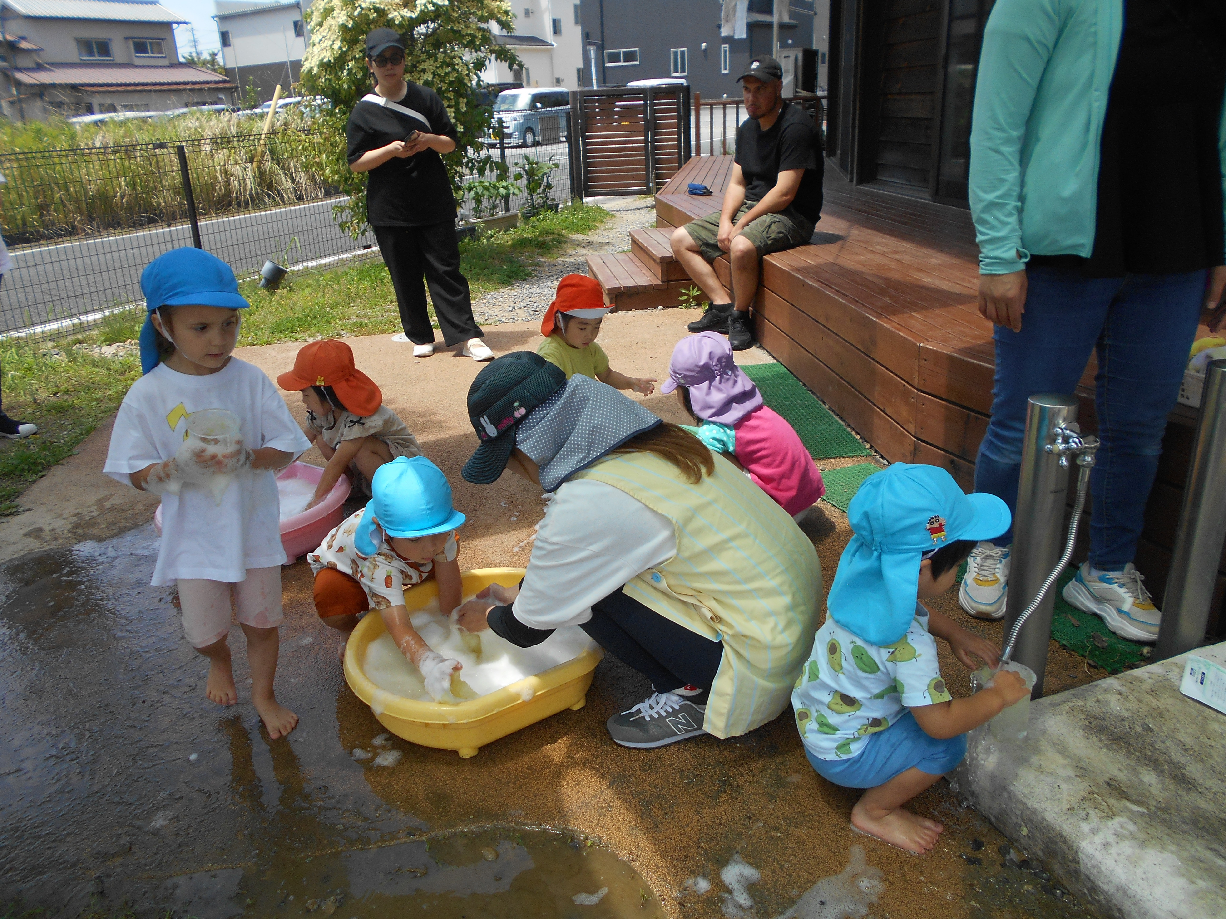 ほし・つき組水遊び、泥んこ遊びを楽しんで冷たさや感触を味わったほし・つき組のお友だち😊 |