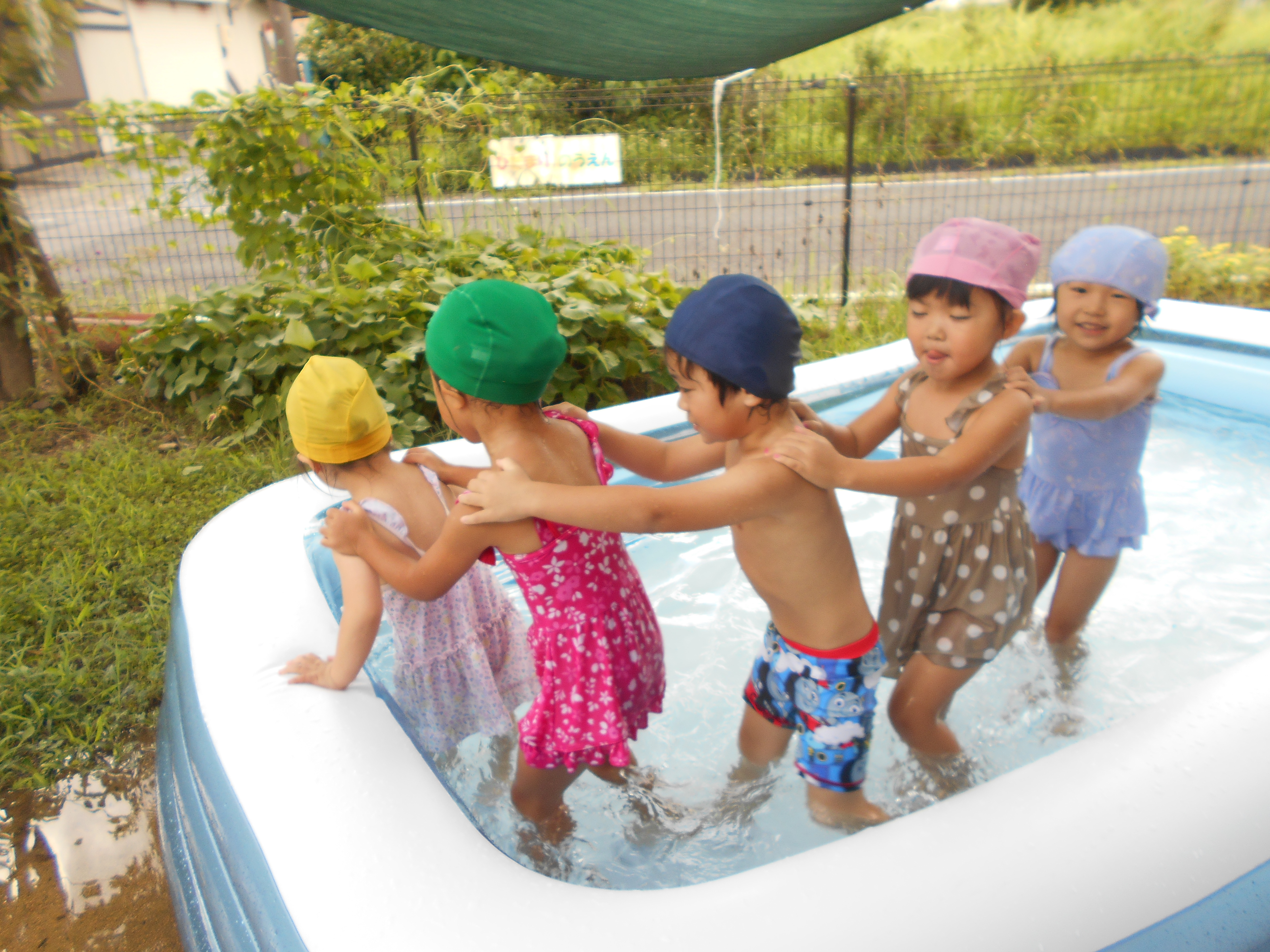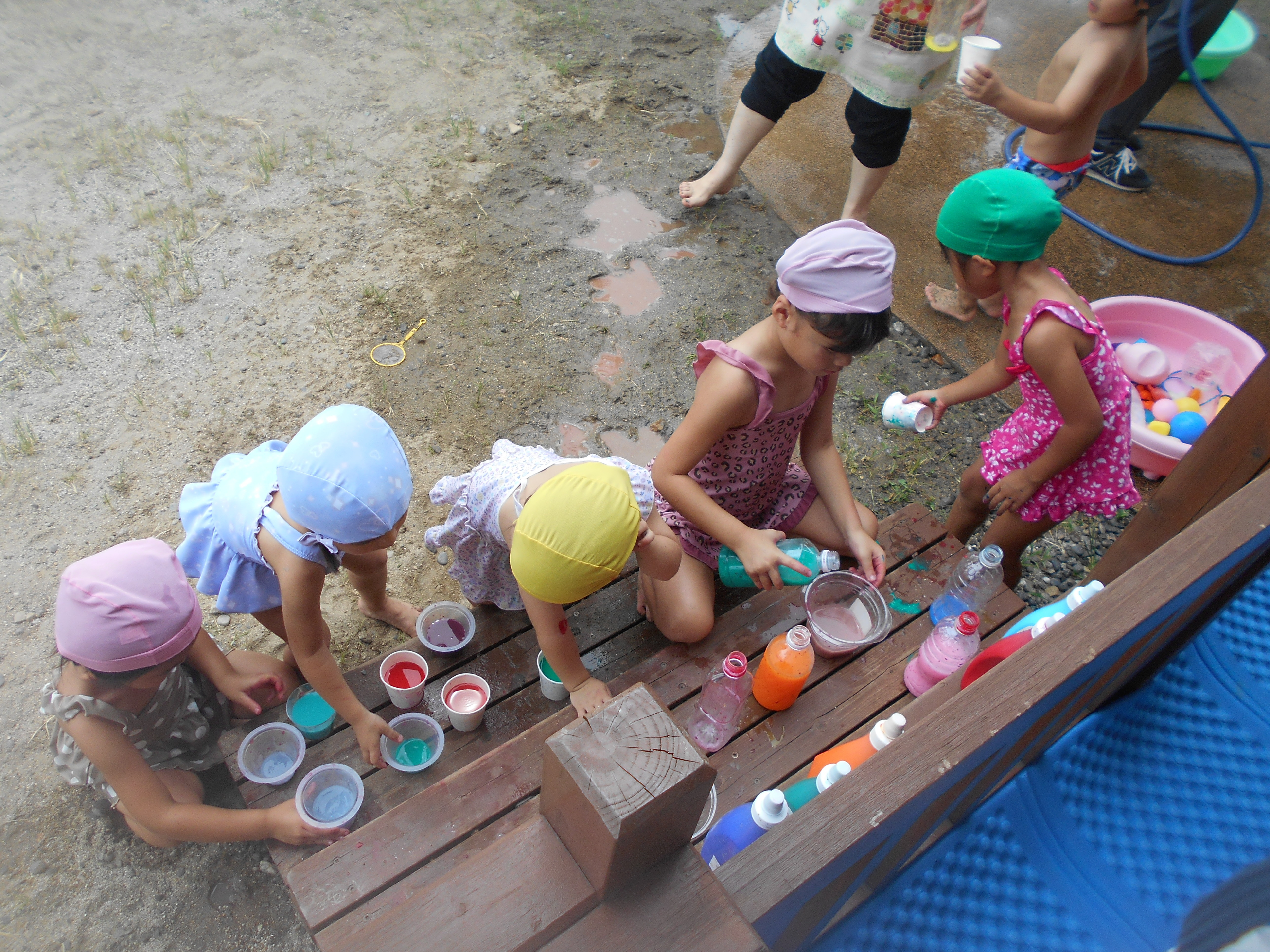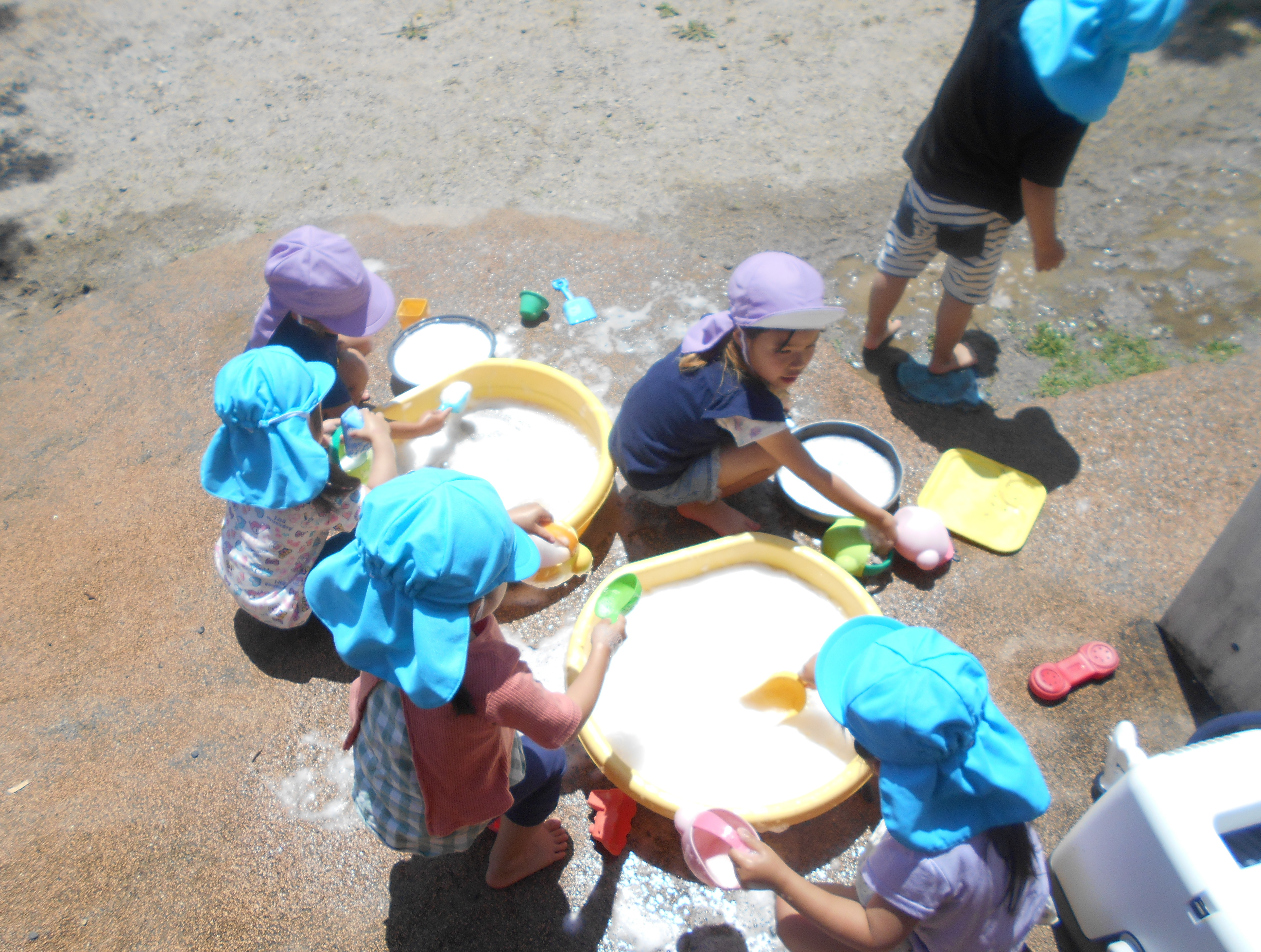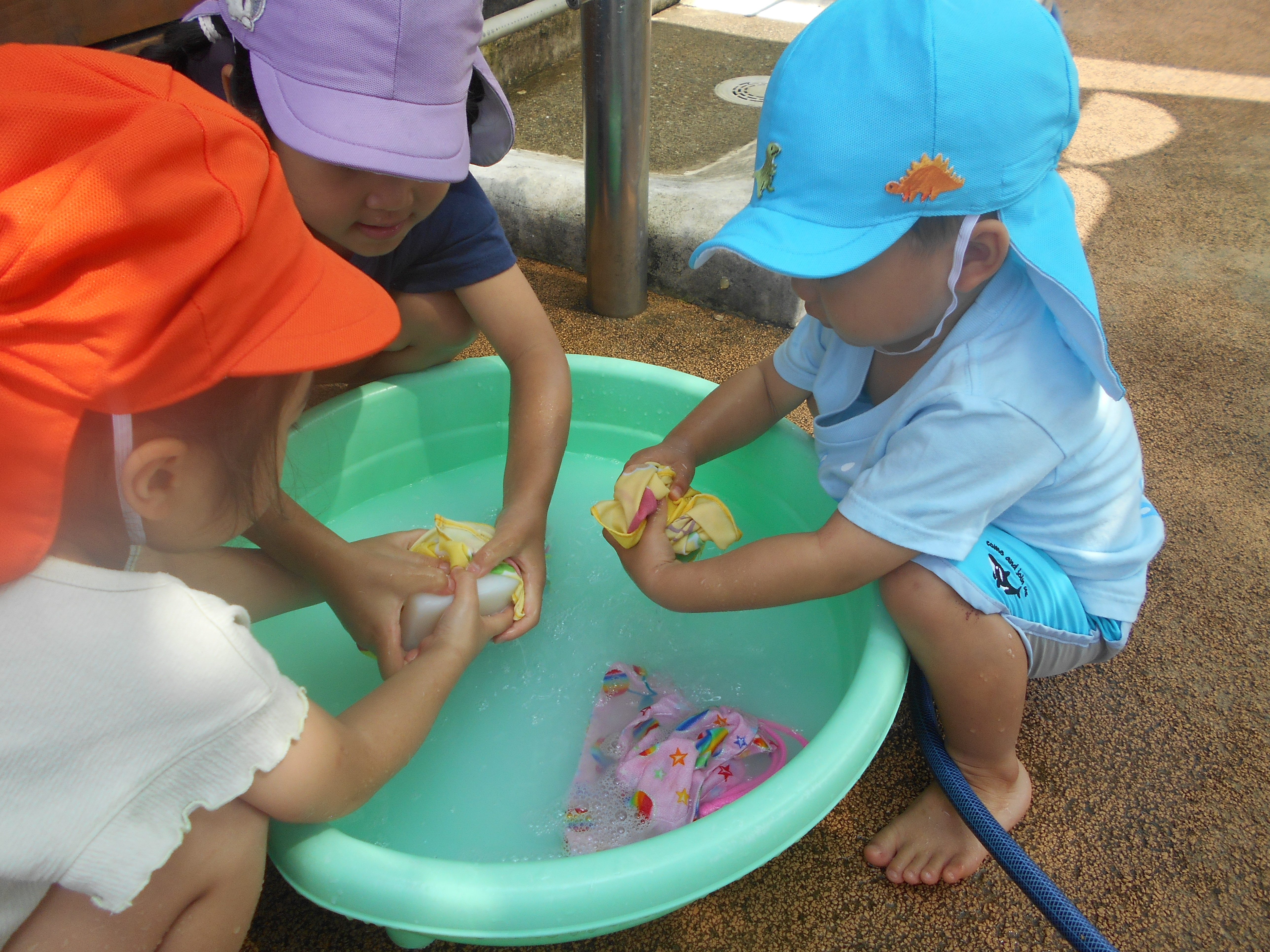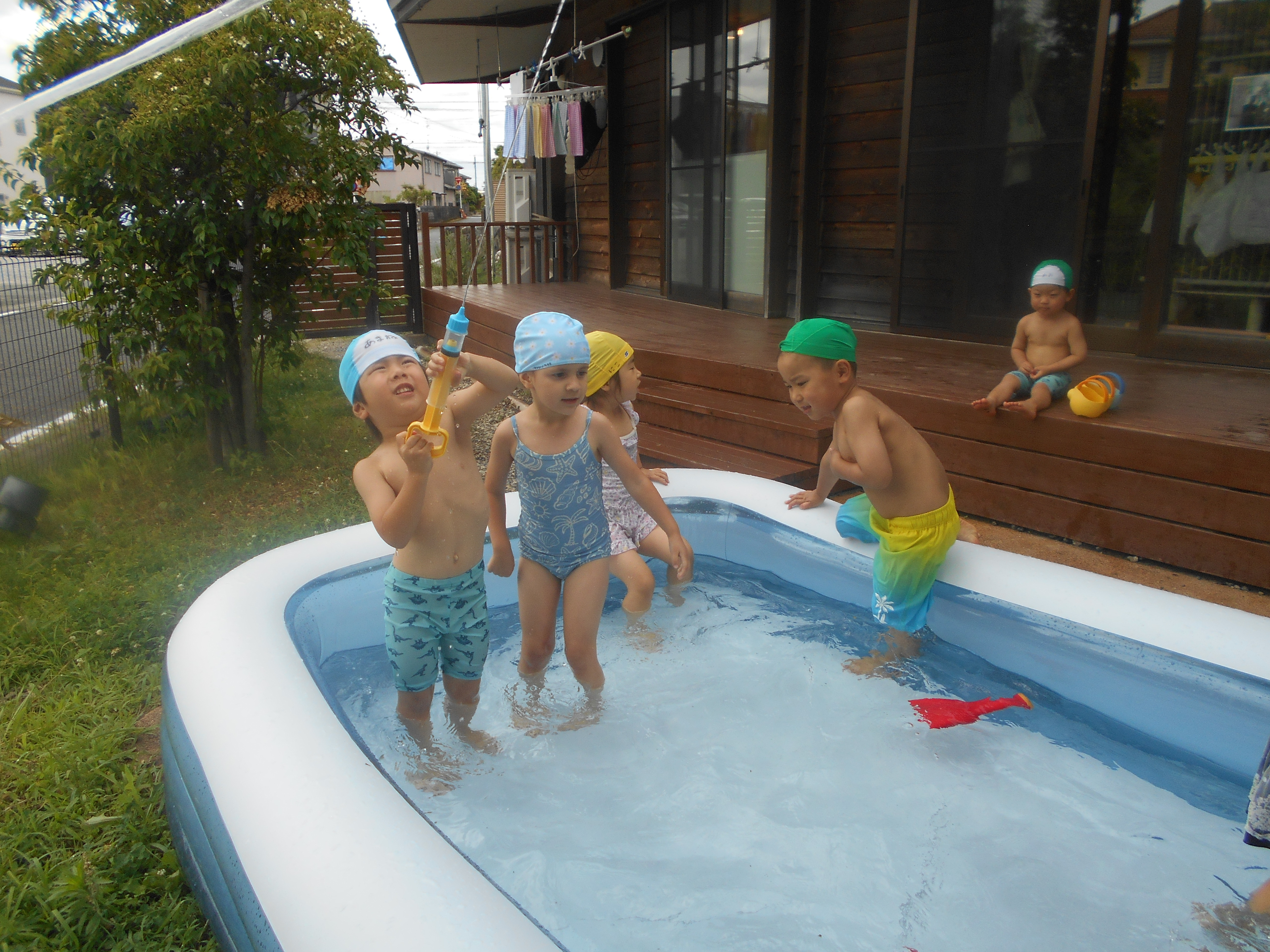 ほし・つき組水遊び、泥んこ遊びを楽しんで冷たさや感触を味わったほし・つき組のお友だち😊 |