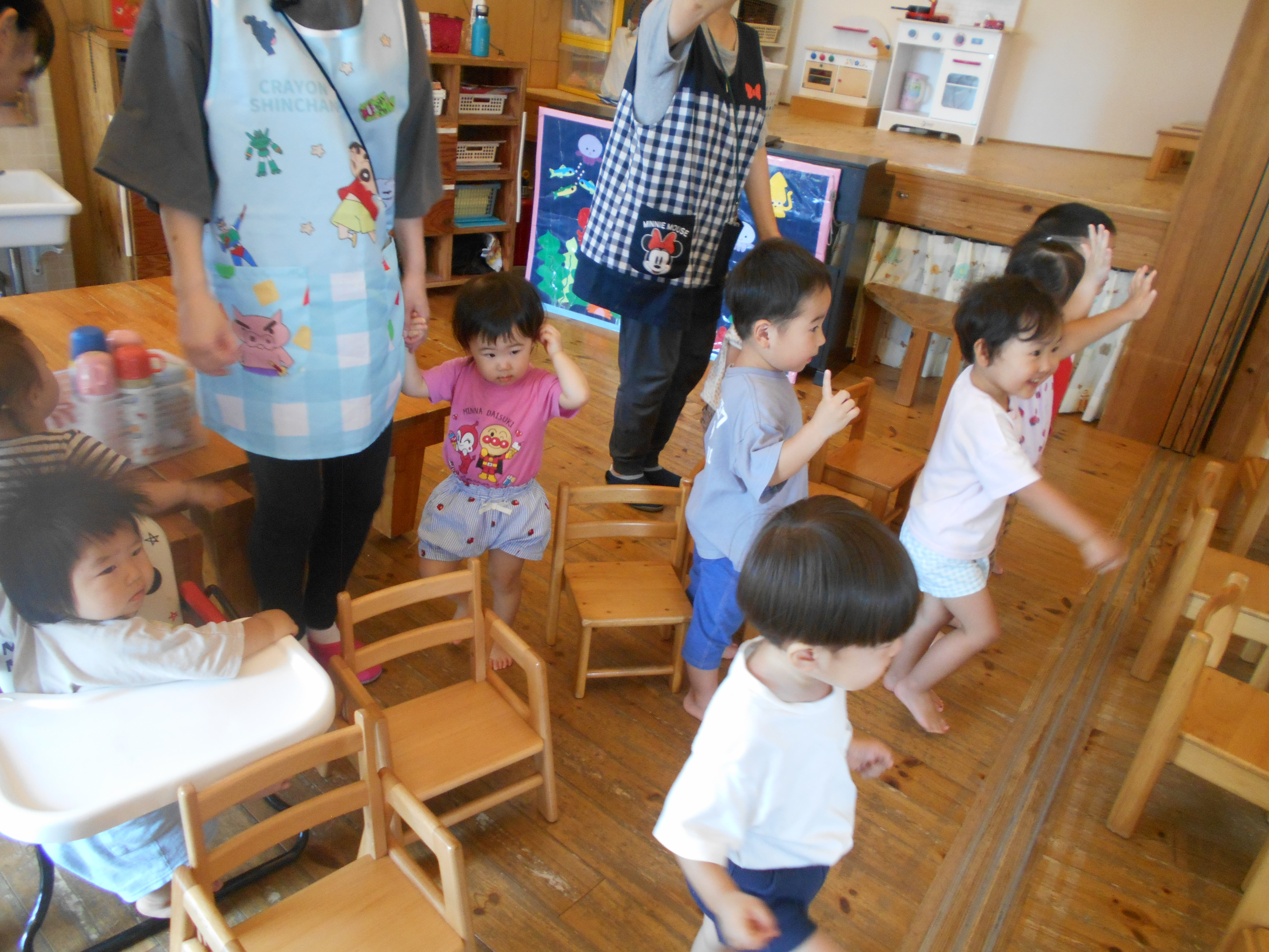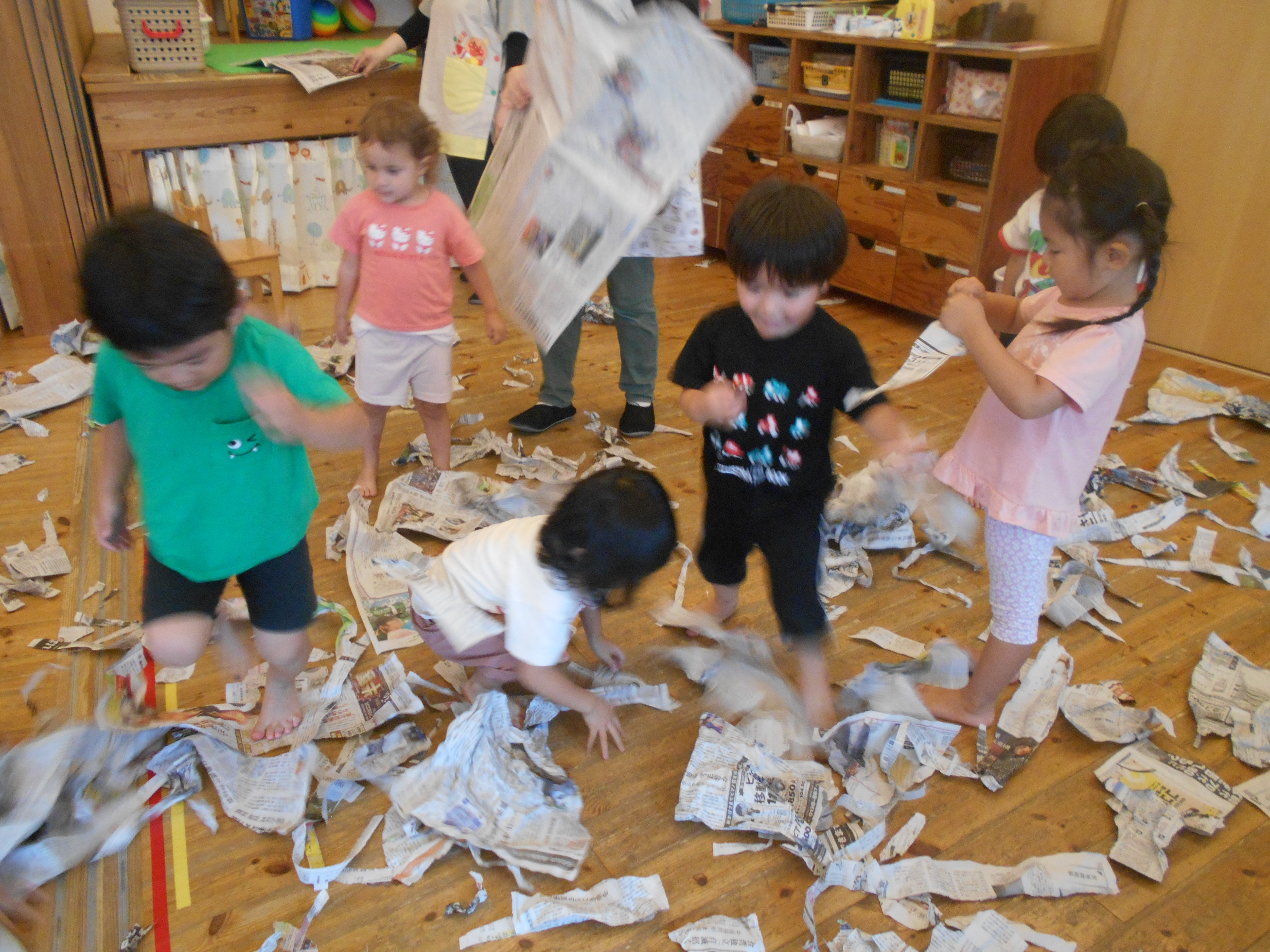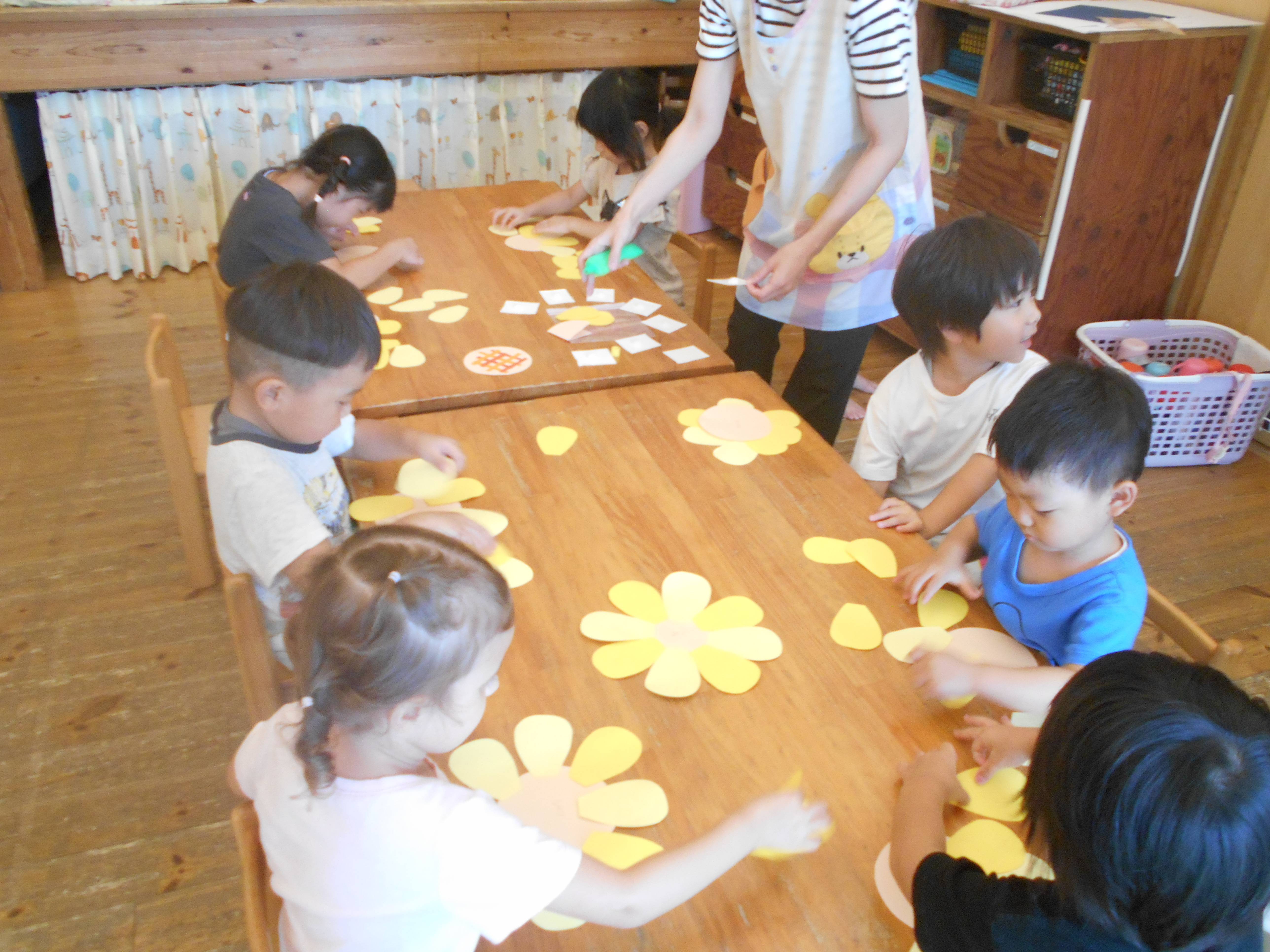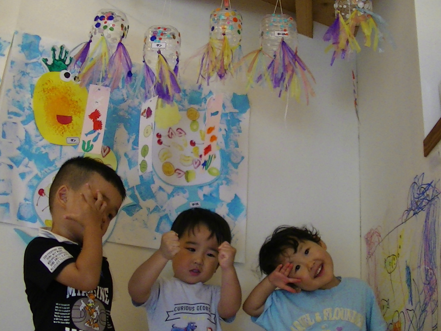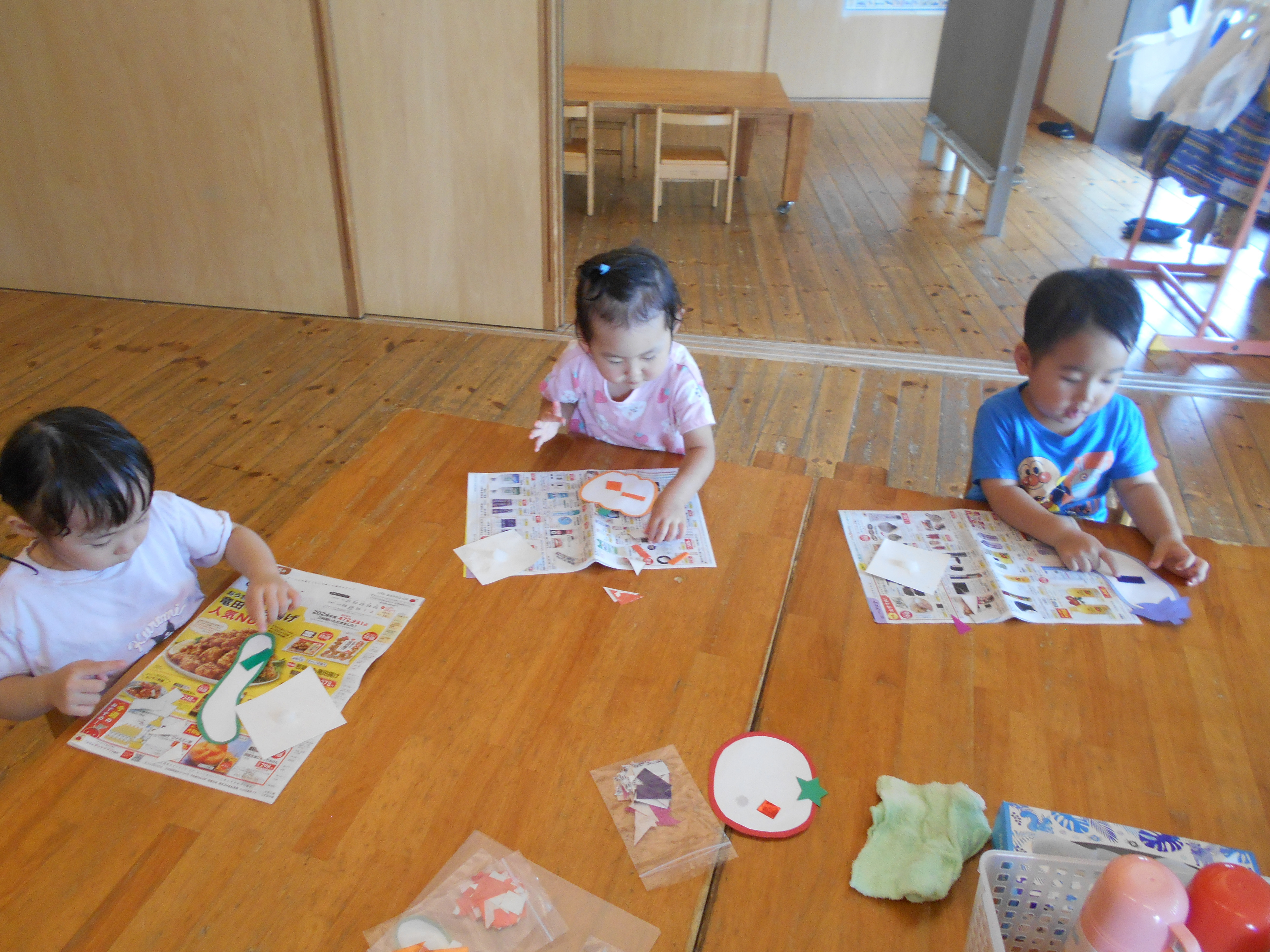 ほしつき暑い日が続いていますが、室内でもマット遊びや製作をして楽しく過ごしています。 |